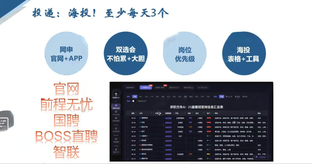 首先在选择方面,她强调要有规划地进行选择,根据个人情况和自身发展规划选择合适的方向,并专心且坚定地做好求职准备。在投递方面,王纪元同学指出要选择海投策略,进行大量的简历投递,同时根据自身倾向选定优先岗位,并建议毕业生可借助APP辅助简历投递管理。