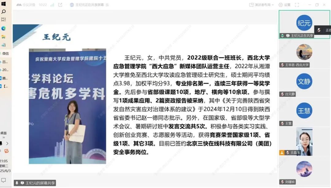 为切实解决毕业生在求职过程中面临的痛点难点问题,推动毕业生实现更加充分和更高质量就业,公共管理学院前期深入调研,立足当下就业环境和现实情况,邀请学院2025届硕士研究生优秀求职毕业生代表王纪元同学,于2025年6月3日线上开展了2026届本硕博学生求职就业经验分享和指导交流会。此次会议旨在精准回应求职学生需求,全面提升同学们的简历制作水平和求职竞争力,助力同学们在求职过程中少走弯路,顺利启航。本次讲座由学院辅导员王晶玉主持。