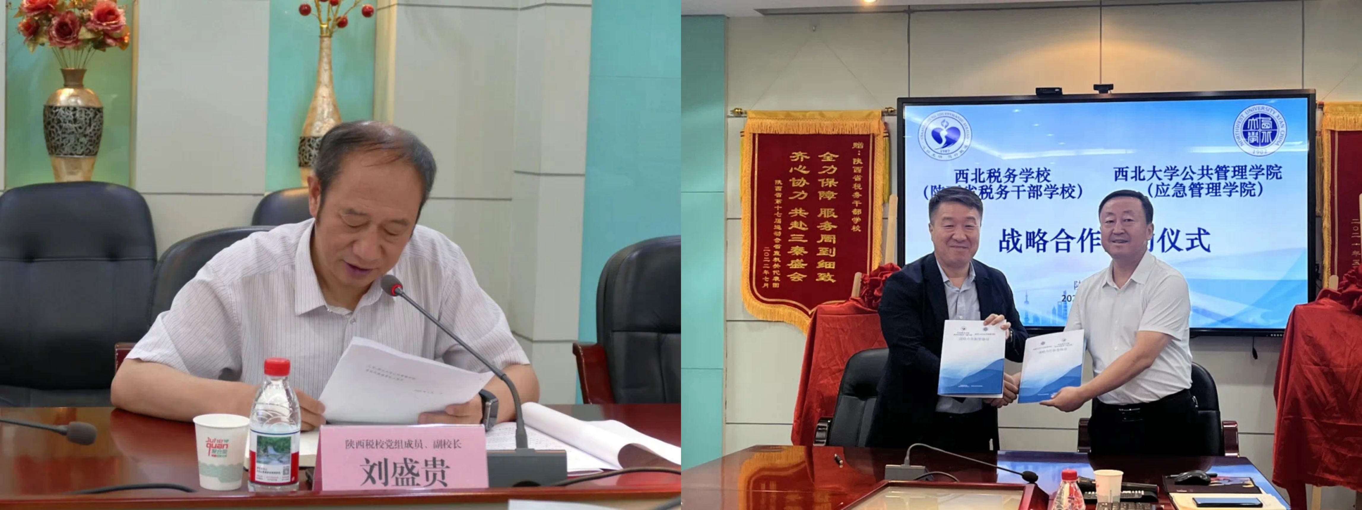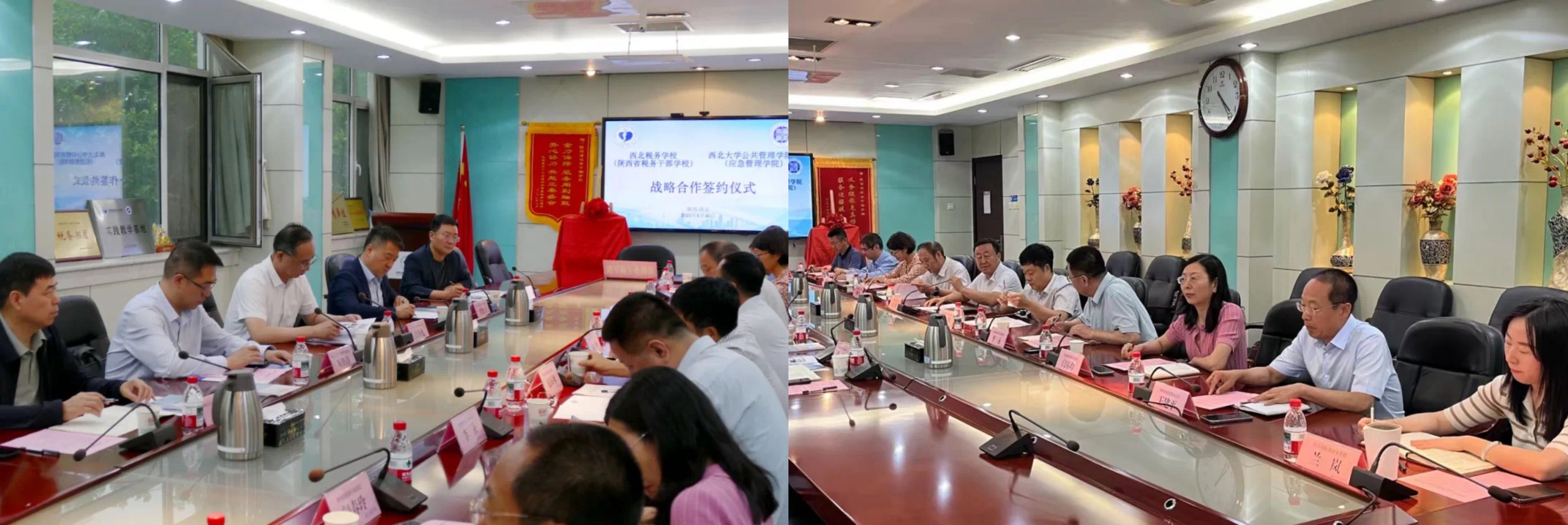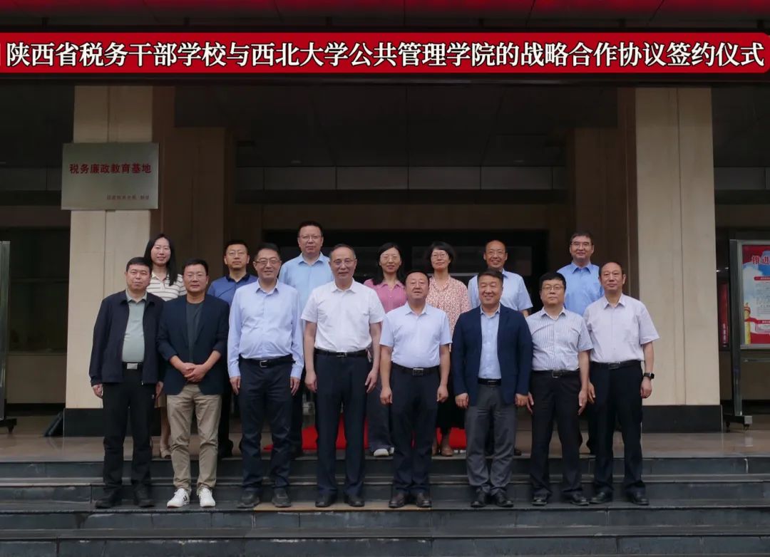 2025 年 5 月 30 日下午,西北大学公共管理学院与陕西省税务干部学校战略合作协议签约仪式在陕西省税务干部学校博学楼隆重举行。我院党委书记窦争光、院长雷晓康、副院长靳洪涛、社会保障系主任吴玉锋、培训中心主任蔡辉,与陕西省税务干部学校党组书记、校长刘峰,党组成员副校长晁海翔、党组成员副校长刘盛贵及各部门负责人共同出席仪式,仪式由陕西省税务干部学校晁海翔副校长主持。
