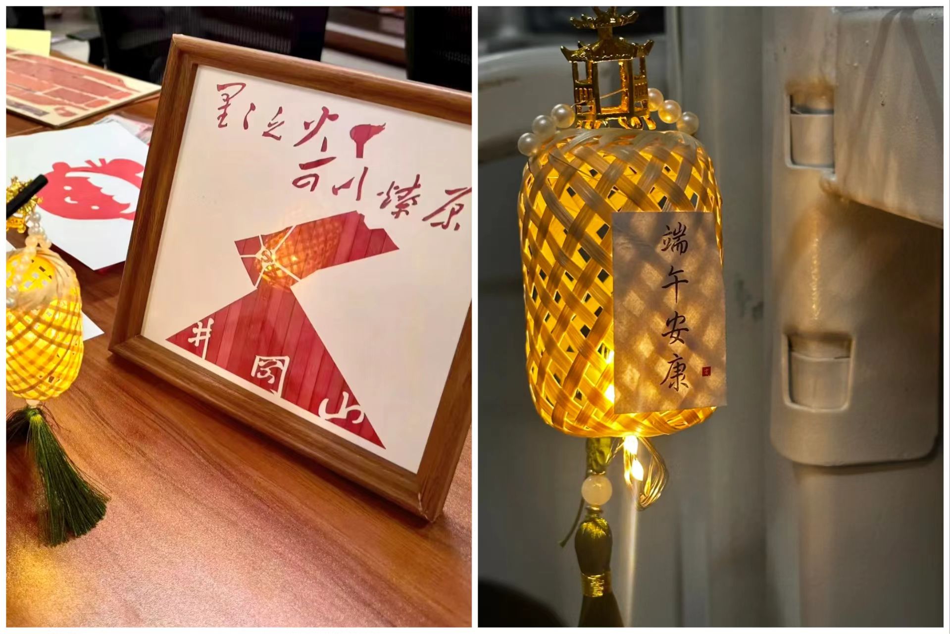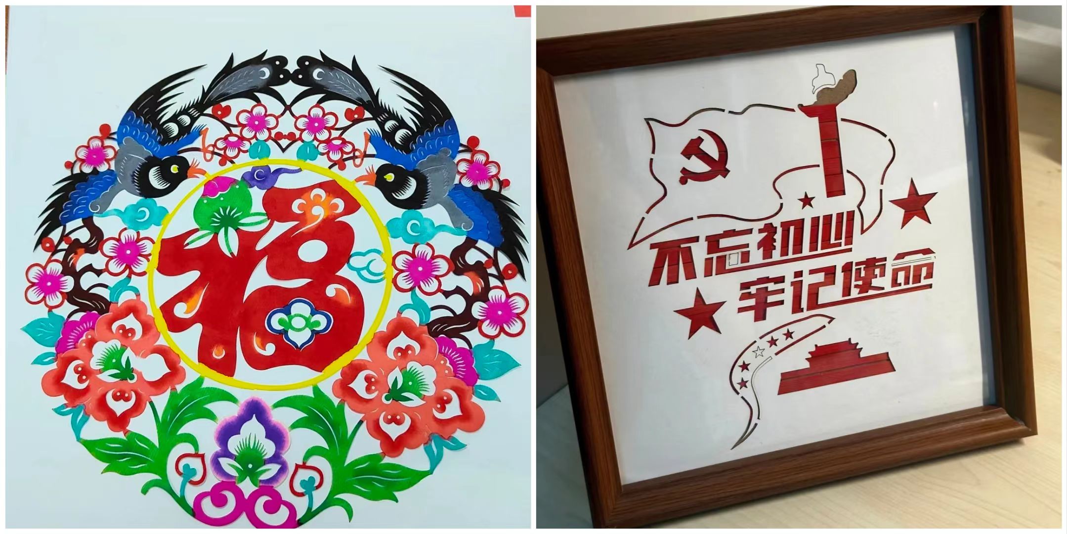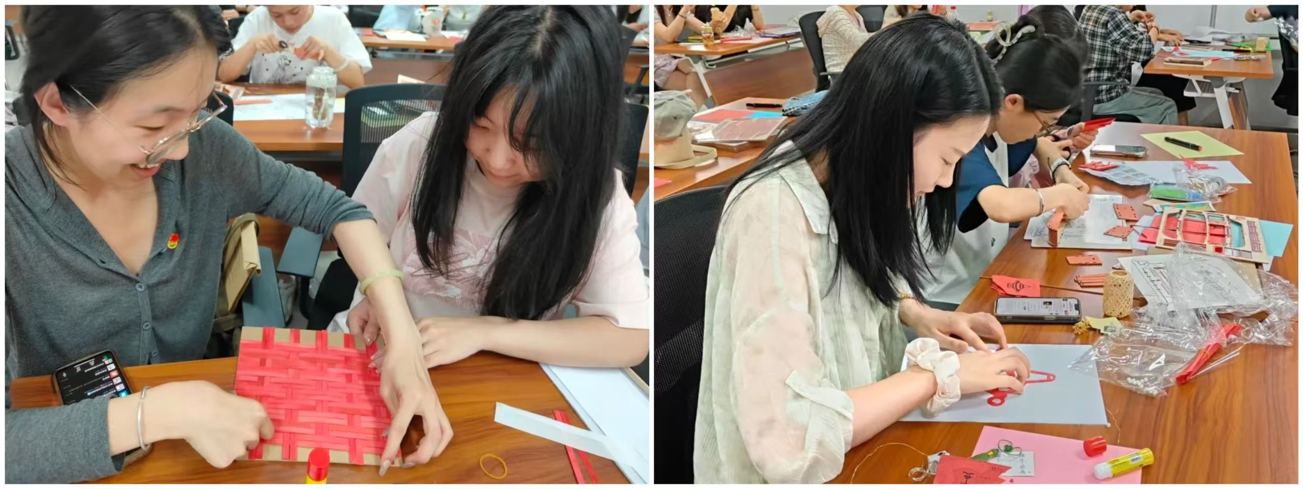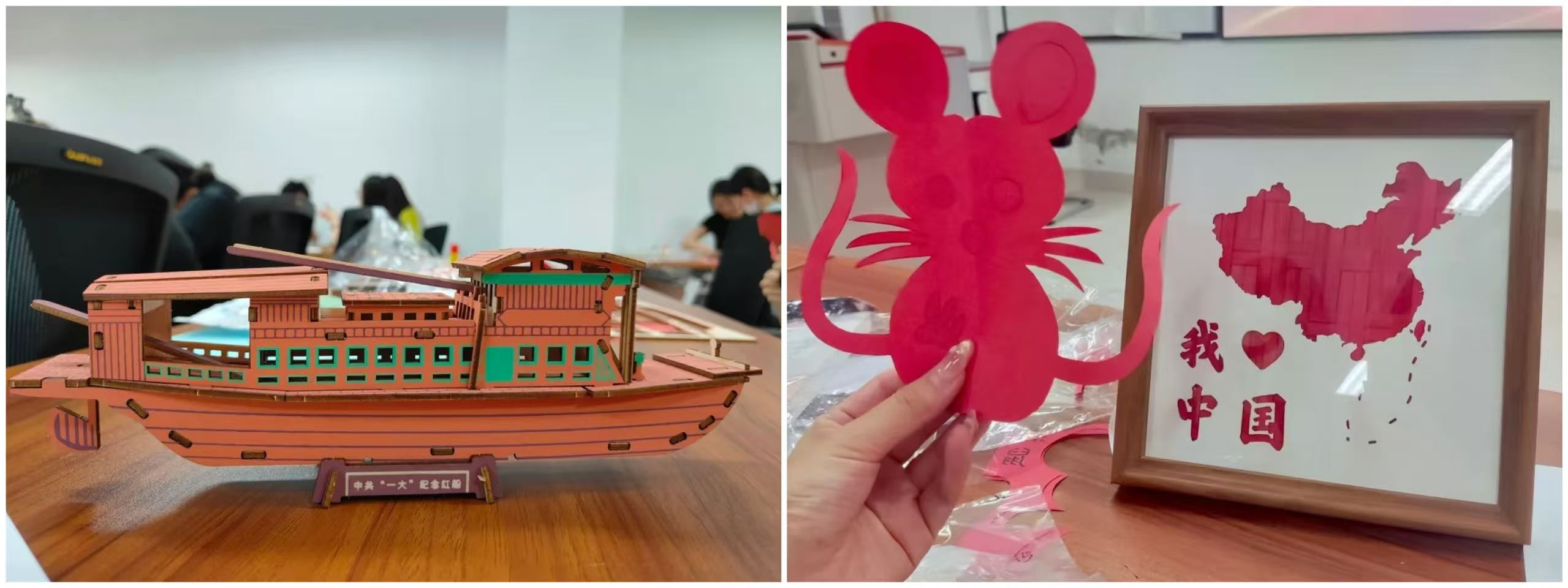 竹丝翻飞织就千年匠心,妙剪生花剪出时代新韵。活动第二部分,支部成员在了解竹编画与剪纸的历史与文化内涵后,分组进行非遗创作实践。竹编画组拿起竹篾认真编织,一块块方正的竹编板逐渐成形,一个个竹编小灯笼亮起;剪纸组从基础线条开始,小心翼翼地用剪刀在纸间穿梭,探索剪纸艺术的魅力,同时体验蔚县彩色剪纸的不同风格。大家在亲身体验中感受非遗文化中的匠心精神,从非遗匠心技艺中汲取精神力量并将其融入工作和生活中。随后,支部成员还体验了“红色手工DIY”动手制作党建相关的红色手工艺品和“嘉兴红船”木板拼图,细致感受红色文化。