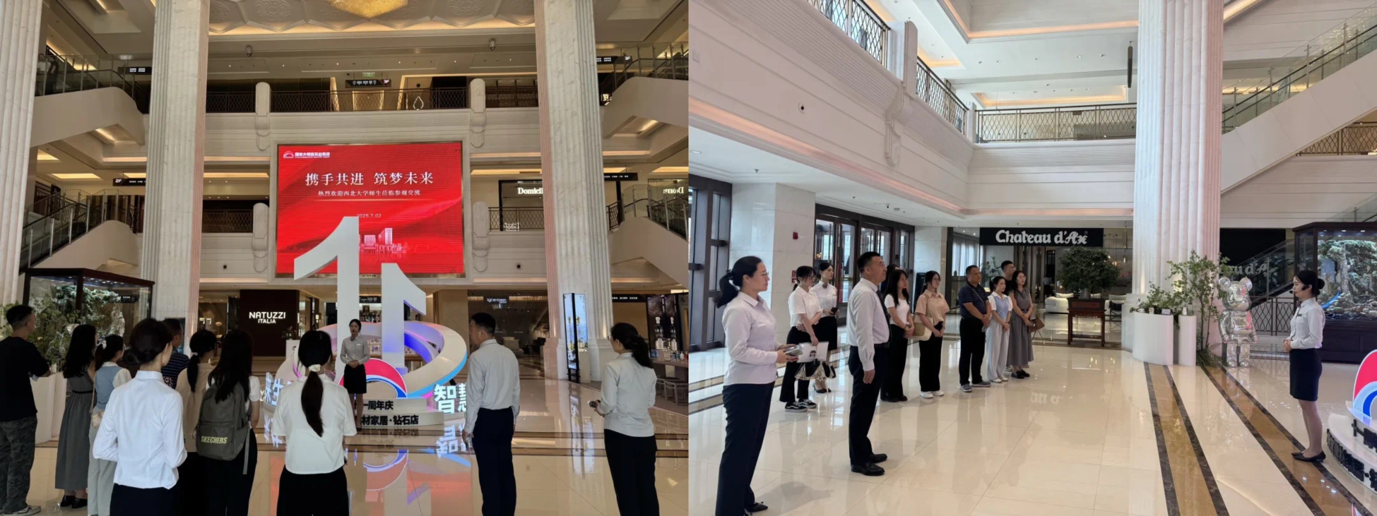 师生一行抵达后,在大明宫实业集团工作人员的引领下,实地参观大明宫钻石店商场的业态布局、品牌矩阵及智能化运营模式。通过了解展厅设计,体验产品功能,求职学生直观感受到行业的创新趋势与市场需求。