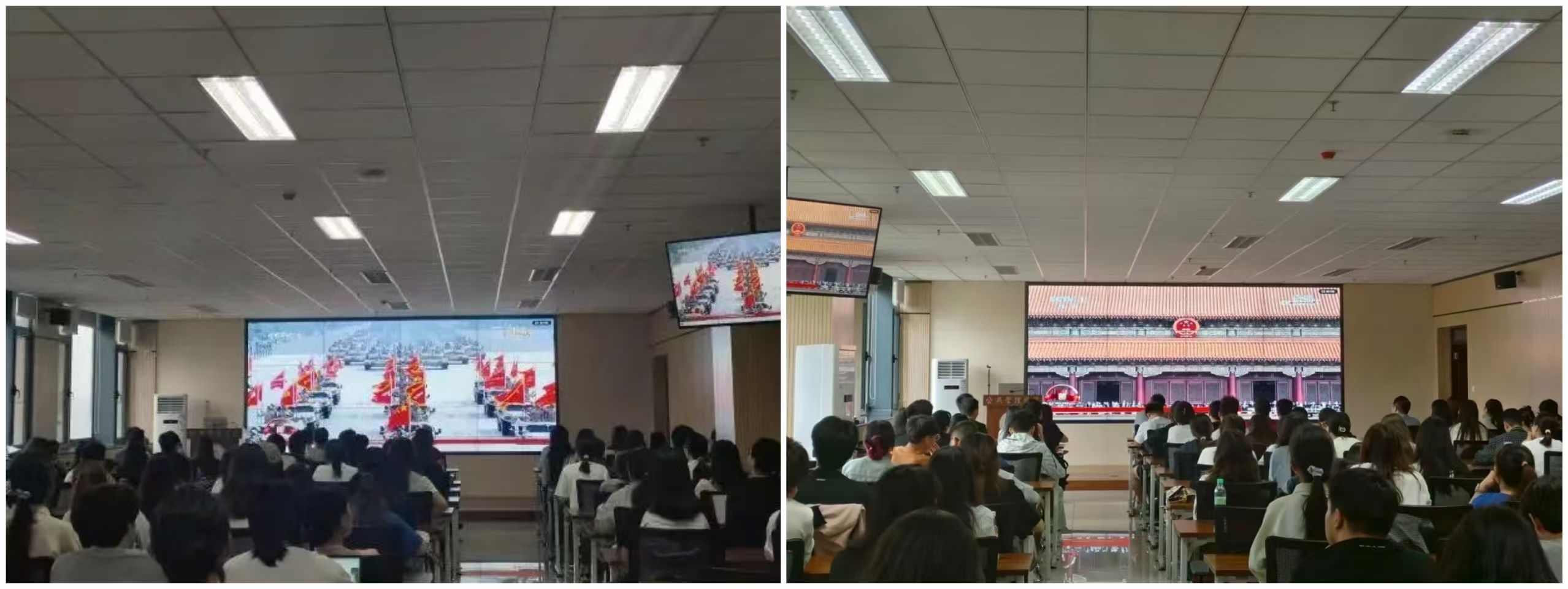 9月3日上午,纪念中国人民抗日战争暨世界反法西斯战争胜利80周年大会在北京天安门广场隆重举行。公共管理学院组织长安校区与太白校区师生集中收看大会直播,共同铭记历史,缅怀先烈。我院党委书记窦争光、院长雷晓康、党委副书记韩杰、副院长靳洪涛、辅导员杨嘉仪、苏林、王晶玉以及教工党员、学生党员、入党积极分子、2025级新生代表同上一堂爱国主义大课,会场上气氛庄重热烈。