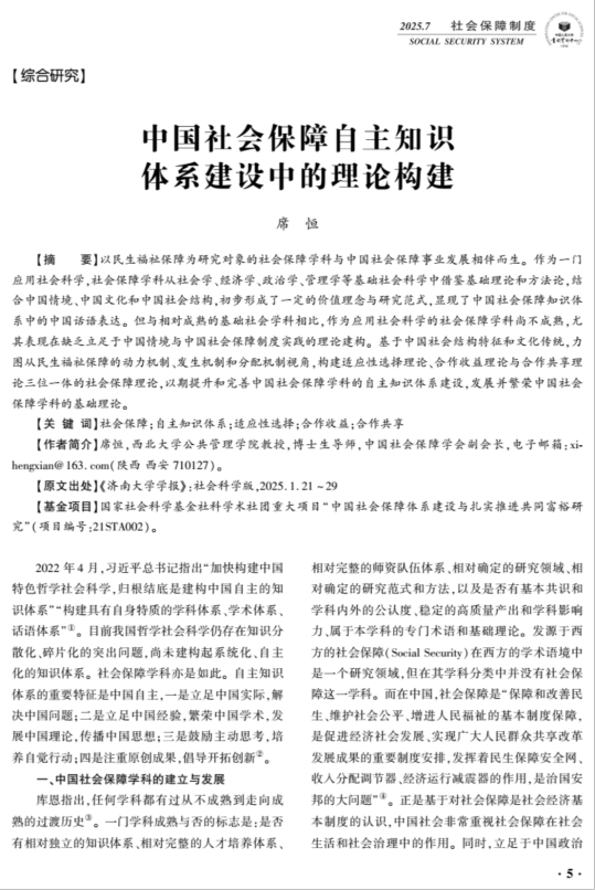 (席恒教授发表的《中国社会保障自主知识体系建设中的理论构建》)