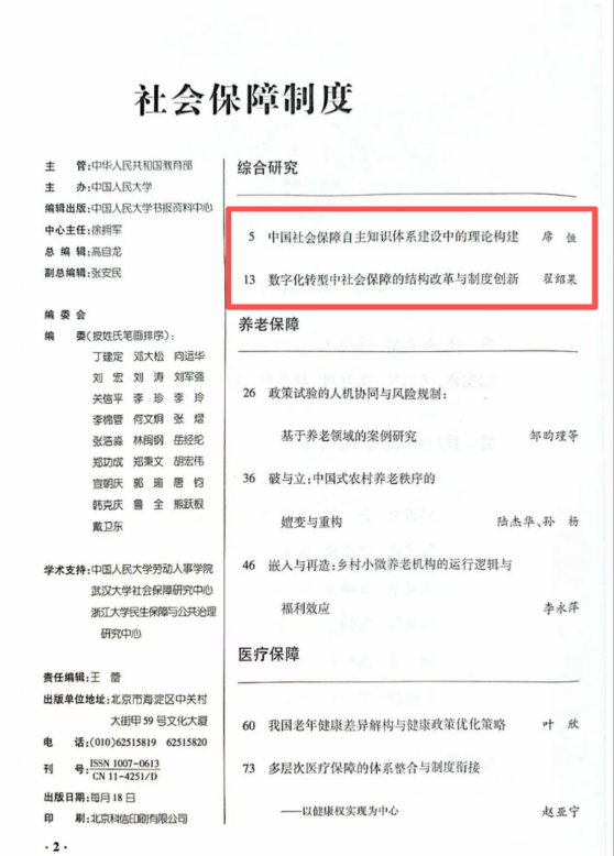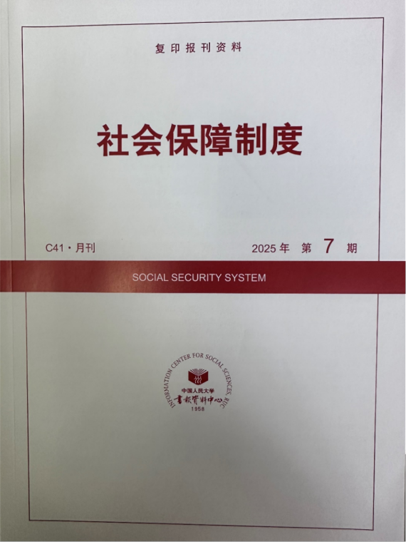 人大复印报刊资料《社会保障制度》2025年第7期同期转载了我院席恒教授发表在CSSCI期刊《济南大学学报(社会科学版)》2025年第1期的《中国社会保障自主知识体系建设中的理论构建》,和翟绍果教授发表CSSCI期刊《社会保障评论》2025年第2期的《数字化转型中社会保障的结构改革与制度创新》两篇学术论文。两篇论文分别立足社会保障的学科发展与制度发展,从理论阐释和实践发展方面回应了“加快构建中国特色哲学社会科学学科体系、学术体系、话语体系”的指导思想,以及数字化转型浪潮中的社会制度创新。