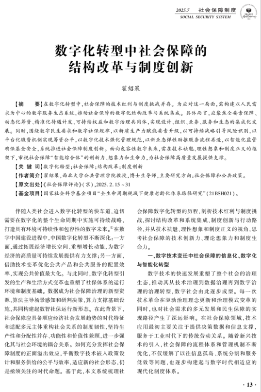 (翟绍果教授发表的《数字化转型中社会保障的结构改革与制度创新》)