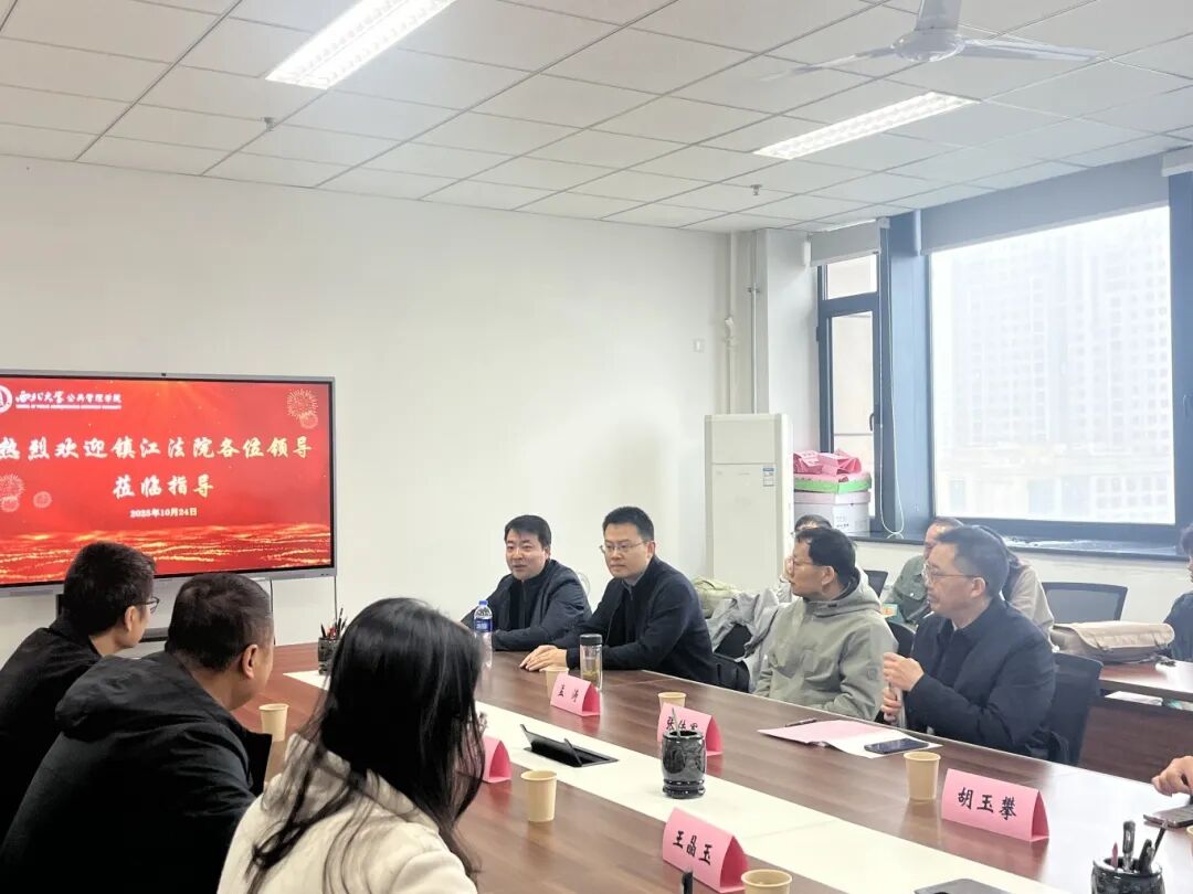 2025年10月24日上午9:00,西北大学公共管理学院于长安校区西教学楼13层中型会议室(北1306)举办镇江法院引才宣介座谈会。江苏省镇江市京口区人民法院院长、党组书记张传军、江苏省句容市人民法院院长、党组书记孟涛、江苏省镇江市京口区人民法院政治部主任、党组成员孙文、江苏省句容市人民法院政治部主任、党组成员胡玉攀、江苏省镇江市中级人民法院组织人事处副处长辛利鹏,公共管理学院学生工作负责人韩杰老师、法学院副处级辅导员陈竟老师、公共管理学院2026届毕业班辅导员王晶玉老师共同参加本次座谈会。