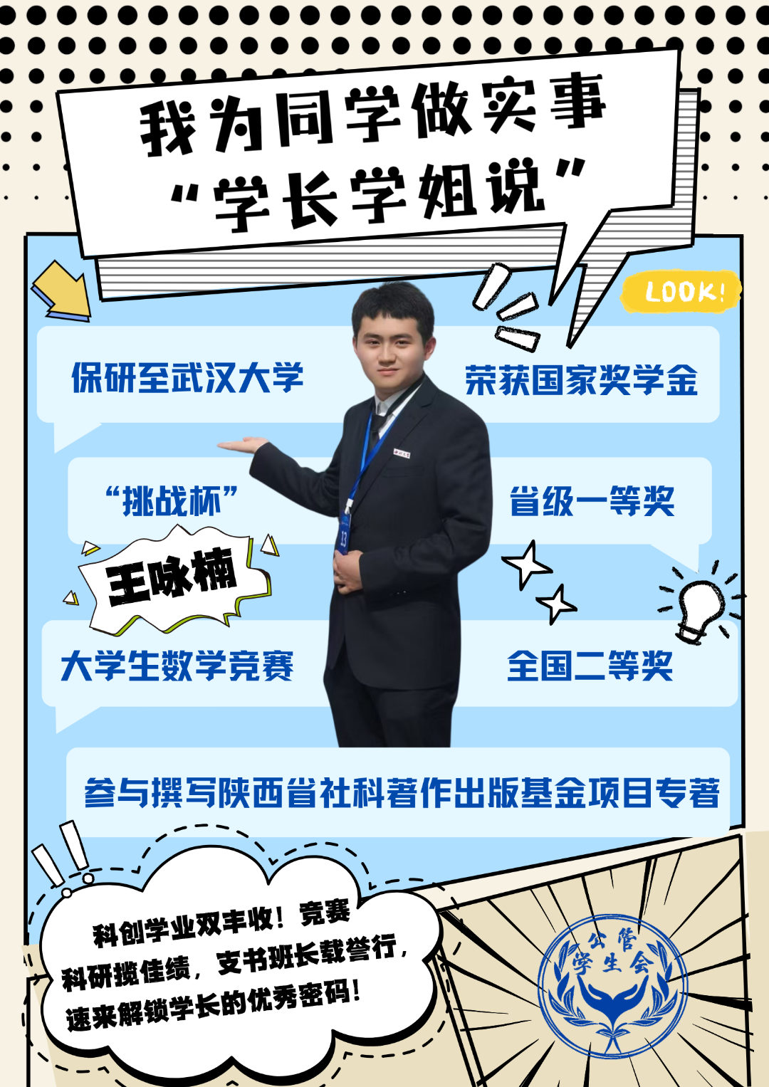 推免远航,逐梦学术,是深耕专业领域、迈向更高学府的优质选择,更是锤炼科研素养、积淀学术能力、开拓未来赛道的关键征程。本次“学长学姐说”朋辈互助活动邀请到2022级图书馆学专业本科生庄苗、2022级图书馆学专业本科生张宇迪、2022级行政管理专业本科生朱海姗、2022级管理科学专业本科生王咏楠为2025级本科生新生带来干货满满的推免备战指南。针对新生在推免初期常见的方向迷茫、准备盲区等问题,学姐学长们精准施策,分享了涵盖学业提升、科研实践、材料筹备的全流程规划方案,不仅帮新生理清了推免核心脉络,更明确了大学四年的成长节奏。这场实用的经验分享,为2025级本科生新生点亮了推免深造的前行灯塔,让学术进阶之路每一步都走得坚定且有力。