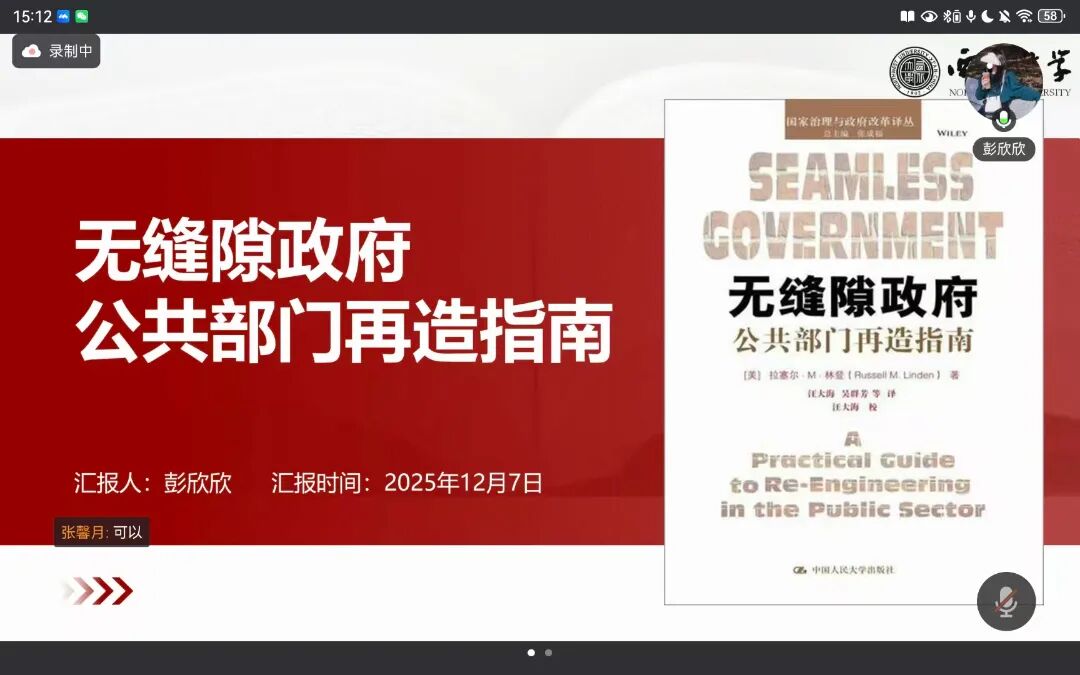 2024级行政管理专业硕士研究生彭欣欣分享的书籍是美国学者拉尔·M·林登的《无缝隙政府公共部门再造指南》。彭欣欣首先介绍了作者及写作背景,强调无缝隙政府理论是在官僚制危机与顾客社会兴起的时代背景下,对新公共管理及无界限组织理念的批判性继承和升级。其次,彭欣欣系统剖析了作者“现实-再造-协同”的写作逻辑。在核心观点阐释部分,彭欣欣提炼出无缝隙政府的顾客、竞争和结果三大导向,并结合书中观点对无缝隙政府理论做出定义。同时,彭欣欣还详细解读了再造的原则、条件、步骤、障碍以及整合方式。在介绍完本书的观点内容之后,彭欣欣对中国本土化的实践应用展开探讨。彭欣欣敏锐地捕捉到无缝隙政府理念与中国服务型政府建设的内在契合性,并选取浙江“最多跑一次”、北京“接诉即办”、广东“粤省事”等典型案例,生动展示了理论本土化创新的强大生命力。最后,彭欣欣指出了该理论在公共性适用、技术依赖陷阱、价值维度缺失等方面的内在局限,并展望了其在中国语境下向“价值-制度-技术”协同方向调适的未来路径。