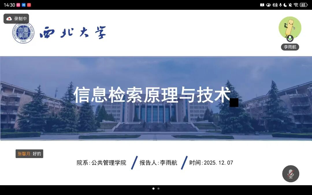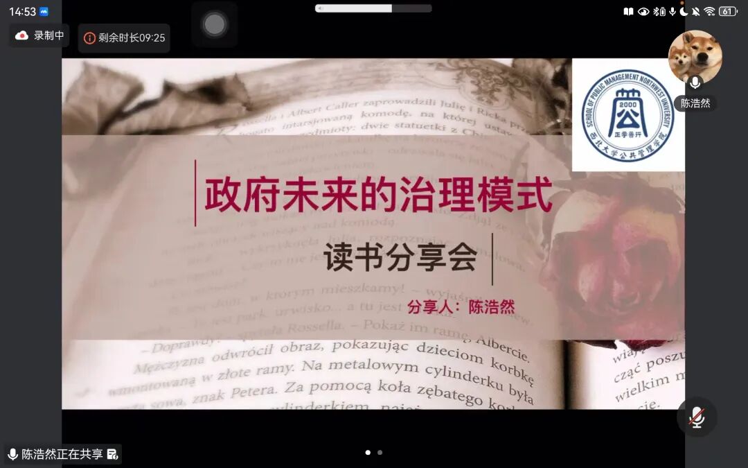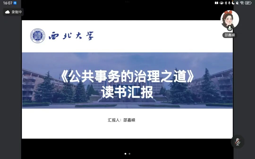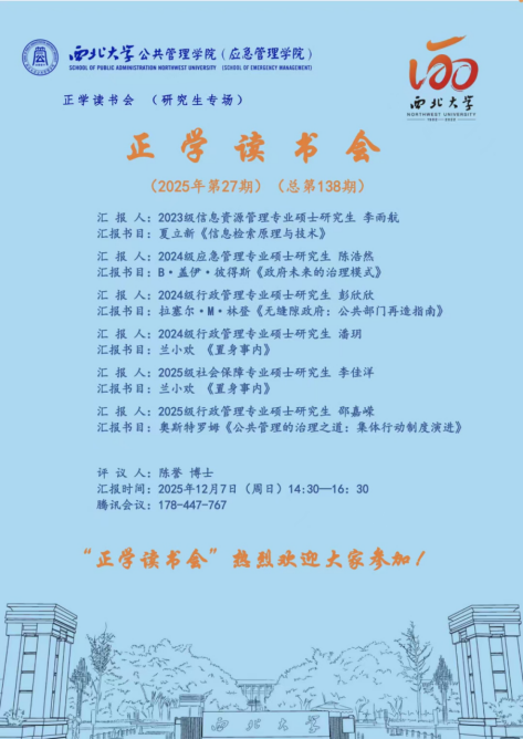 2025年12月7日,我院线上举办了2025年第27期正学读书会(总第138期)。西北大学公共管理学院2023级信息资源管理专业硕士研究生李雨航,2024级应急管理专业硕士研究生陈浩然,2024级行政管理专业硕士研究生彭欣欣,2024级行政管理专业硕士研究生潘玥,2025级社会保障专业硕士研究生李佳洋,2025级行政管理专业硕士研究生邵嘉嵘,分别作为主讲人进行读书汇报,公共管理学院2025级博士研究生陈誉担任评议人,部分研究生旁听了此次读书会。