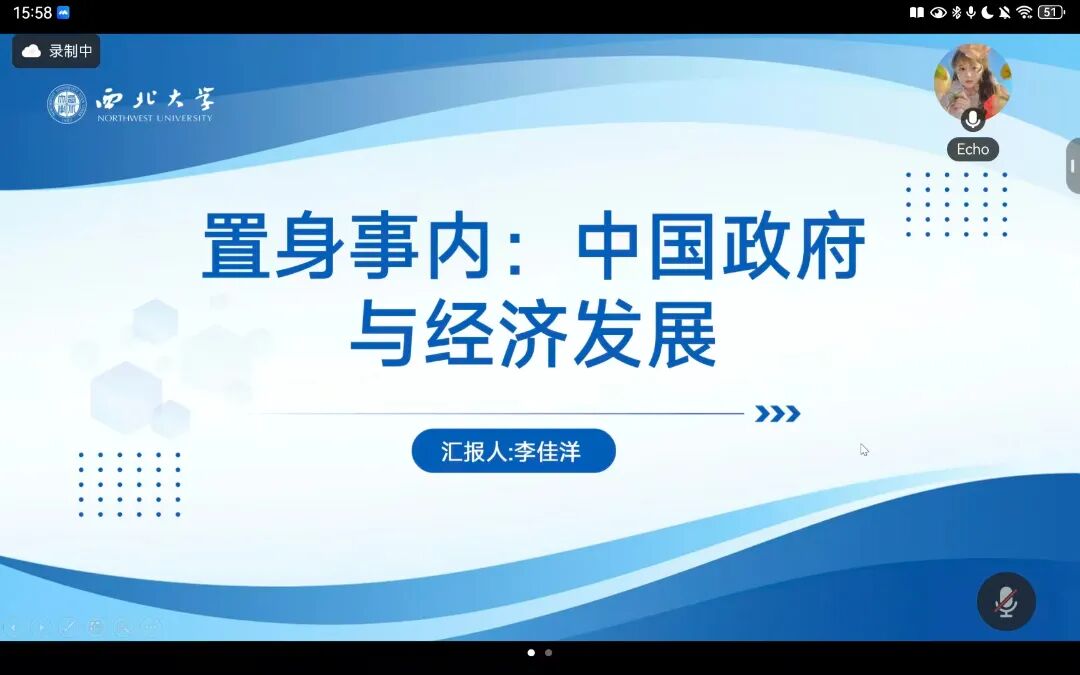 分享伊始,李佳洋同学介绍了《置身事内》的核心价值。该书跳出纯理论框架,从政府内部视角切入,用真实案例连接经济学理论与中国实践,打破了 “政府与市场对立” 的固有认知,为解答 “中国经济为什么能” 提供了独特视角。在解读政府与市场关系时,她提出中国形成了 “发展型政府” 共生模式,政府既是规则制定者,更是深度参与者,这种 “嵌入” 式参与成为中国经济发展的独特密码。