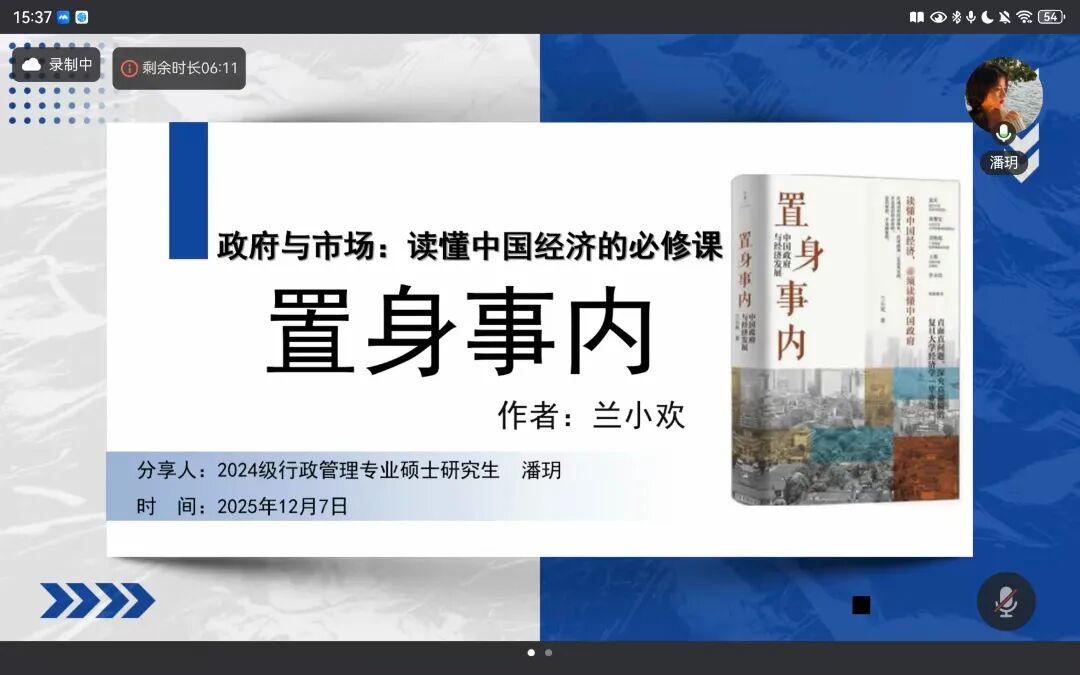 2024级行政管理专业硕士研究生潘玥的分享主要围绕《置身事内:中国政府与经济发展》一书展开,系统介绍了该书的作者、结构与核心观点,并准确指出了其作为行政管理专业重要读物的价值。分享条理清晰,能够把握本书“理解中国政府角色”的核心主旨,并以书中富有温度的话语作结,体现了较好的归纳与共情能力。