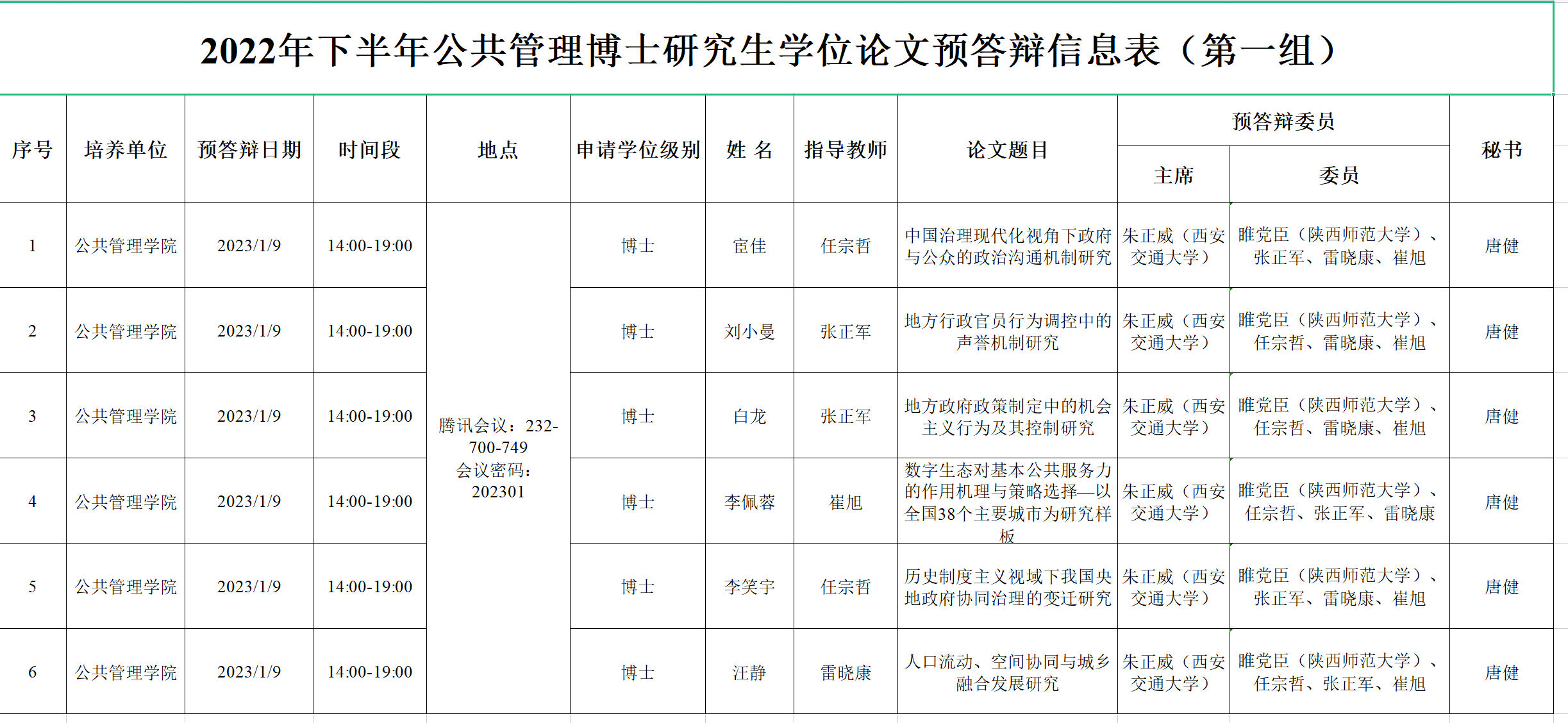 2022年下半年公共管理博士研究生学位论文预答辩信息表(第一组)