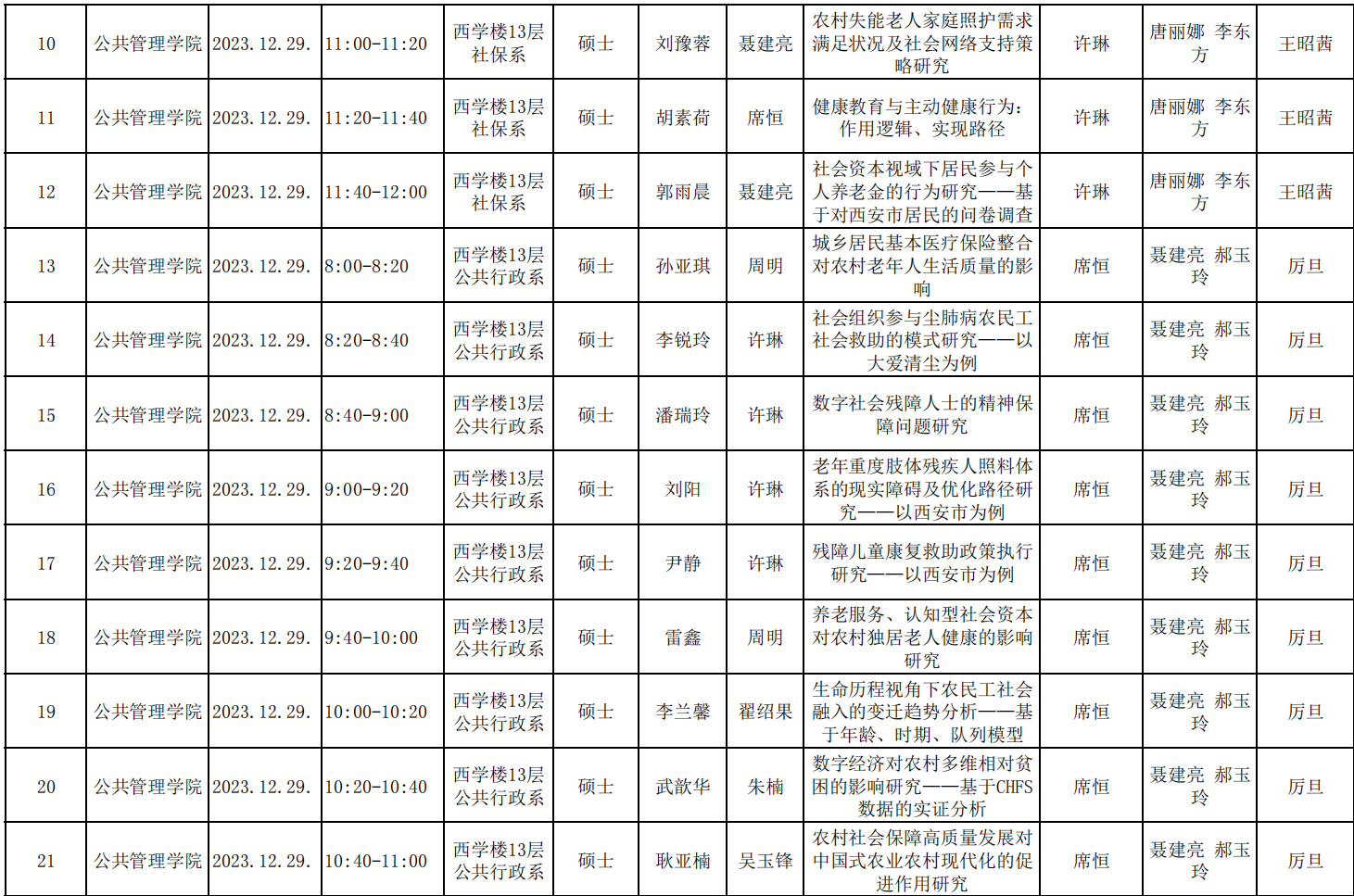 2021级社会保障方向学术研究生学位论文预答辩信息表