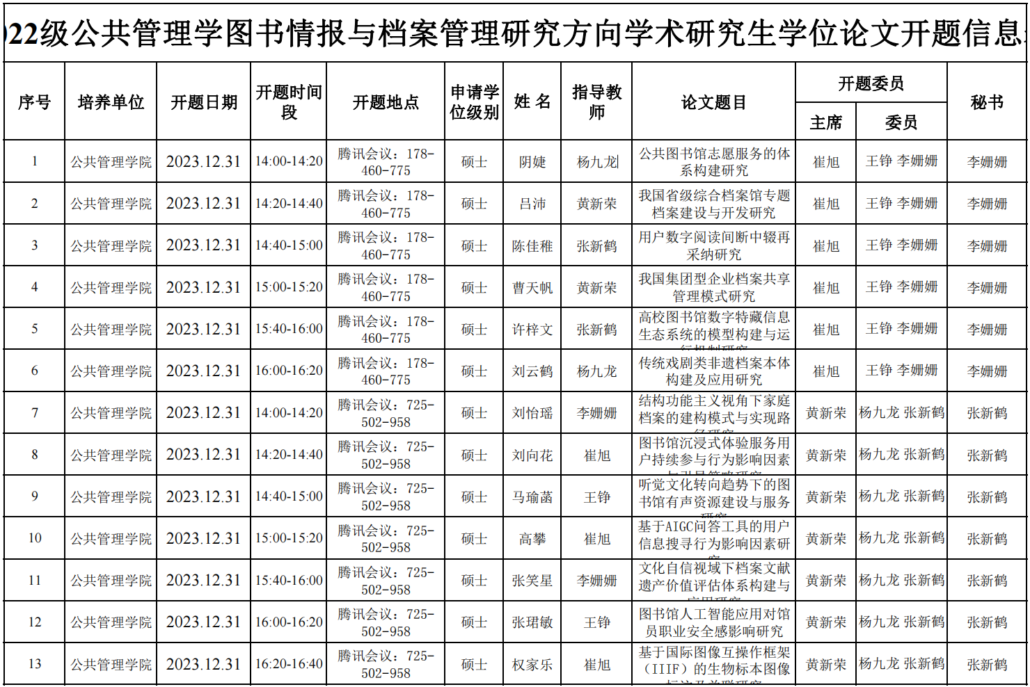 2022级公共管理学图书情报与档案管理研究方向学术研究生学位论文开题信息表