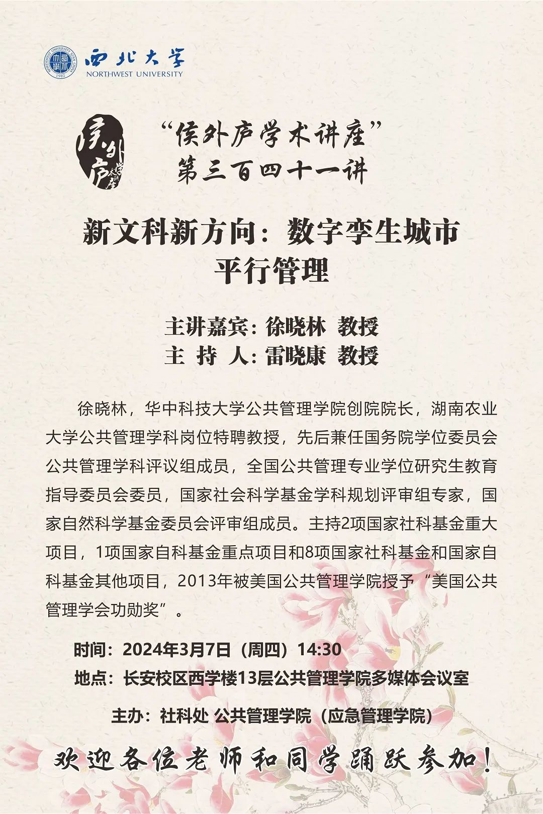 会议预告 | “侯外庐学术讲座”第三百四十一讲 新文科新方向:数字孪生城市平行管理