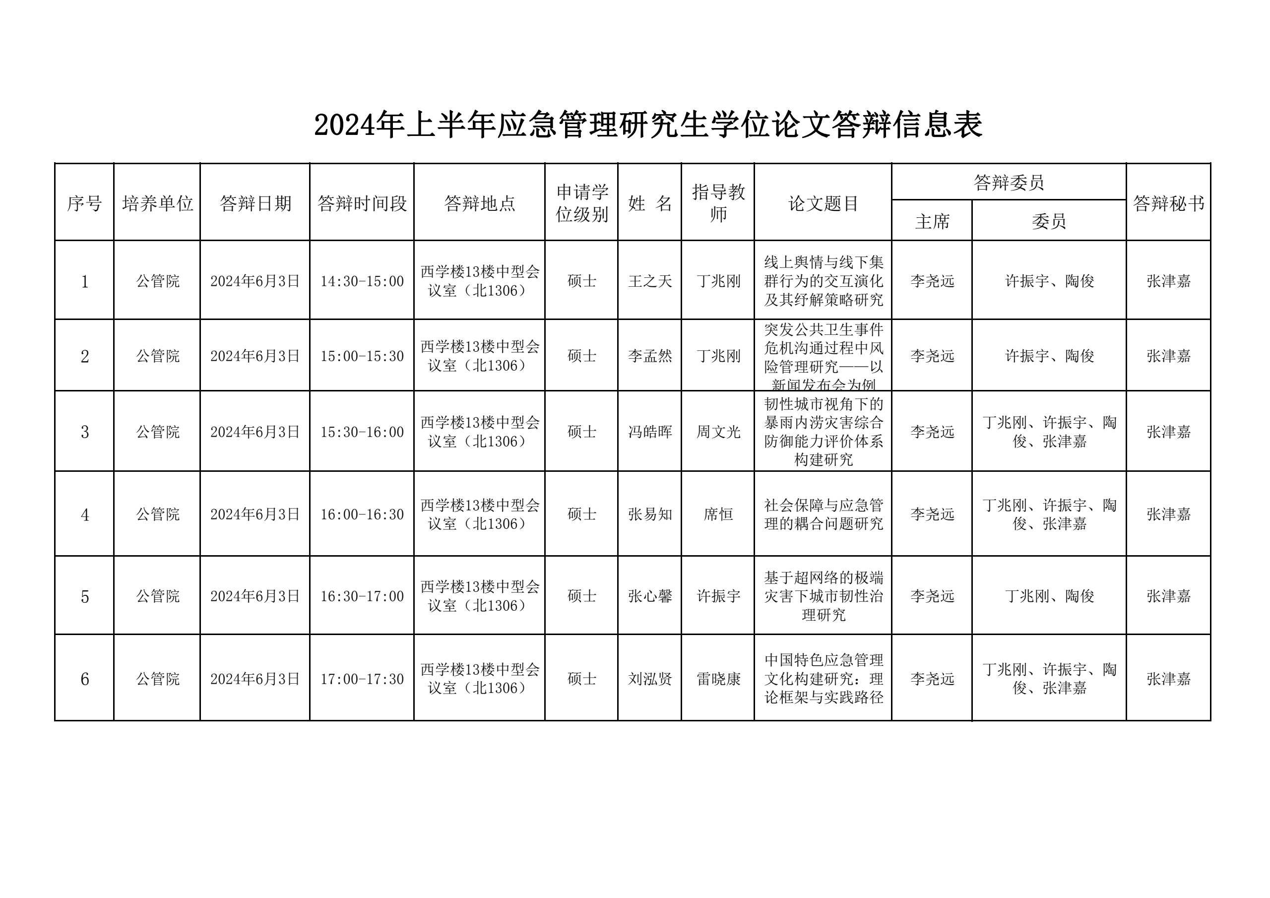 2024年上半年应急管理研究生学位论文答辩信息表