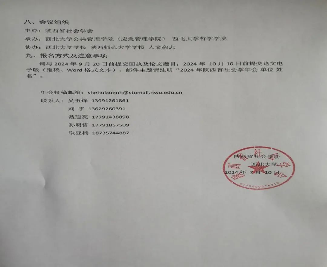 请于2024年9月20日前提交回执及论文题目;2024年10月10日前提交论文电子版(定稿、Word格式文本),邮件主题请注明“2024年陕西省社会学年会-单位-姓名”。