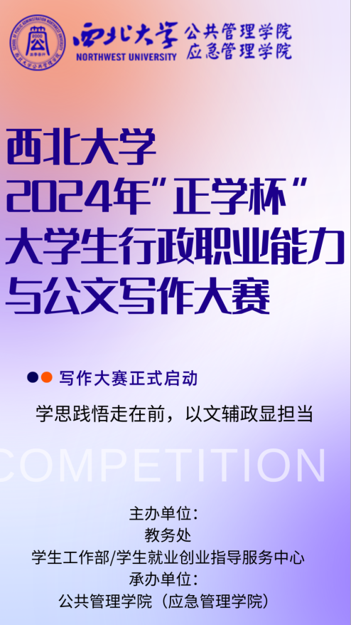良好的行政职业能力和公文写作水平对于大学生的个人发展和未来的职业选择具有极其重要的意义。为提升我校学生言语理解与表达、逻辑推理、资料分析、问题分析与解决、公文写作等行政职业能力,提高人才培养质量,特举行西北大学2024年“正学杯”大学生行政职业能力与公文写作大赛。