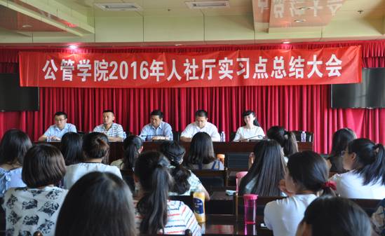 2016年7月1日下午,公共管理学院2016年省人社厅实习点总结大会顺利召开,省人社厅人事处吴应智处长、谭相川主任,学院教学副院长杨九龙、党委副书记寇嘉及人社厅实习点带队老师王欣亮、全体实习学生共40余人参加会议,会议由带队老师王欣亮主持。