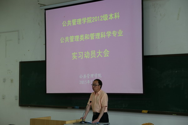 5月8日上午9:00学院召开了2012级公共管理类和管理科学专业实习动员大会。孙录见书记、杨九龙副院长、何君安老师、朱楠老师、邓武红老师、孟蕾老师、许振宇老师、韩杰老师及全体实习学生参加了会议。