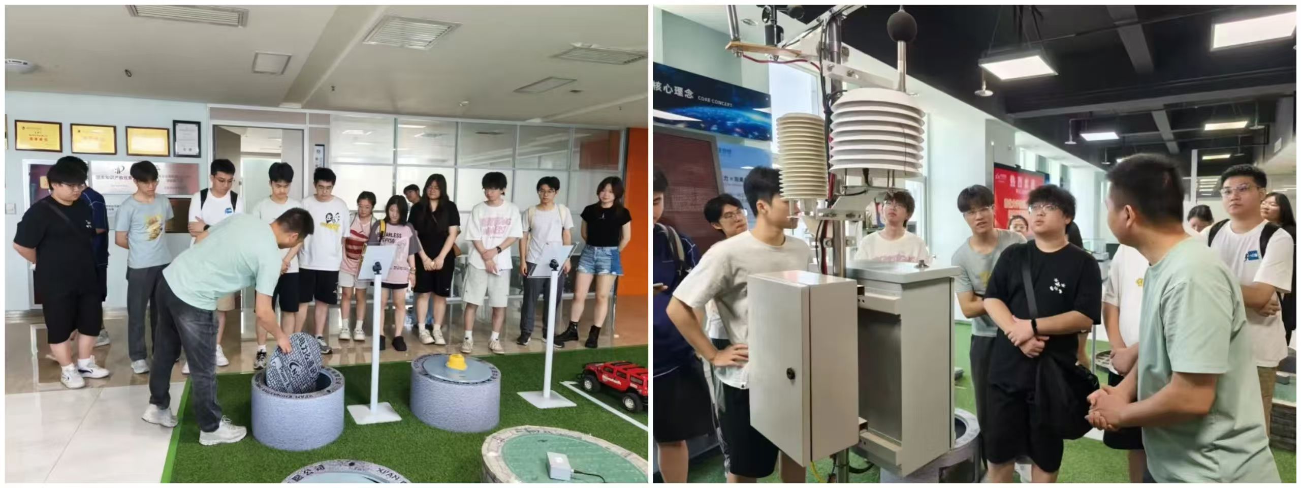 随后,在朱老师的带领下,同学们参观了中星测控的产品展示区。这里陈列着各类先进的应急监测设备、预警系统及各类智慧城市传感设施。同学们亲眼目睹了有关产品的功能,边观察、边询问、边体验各类创新设备与应用平台,直观感受智慧应急产品在模拟场景中的应用情况,如通过智能传感器实时监测水位变化、利用大数据分析预测灾害发生概率等,这些直观生动的展示让同学们对智慧应急技术的实际应用有了更为深刻的理解。