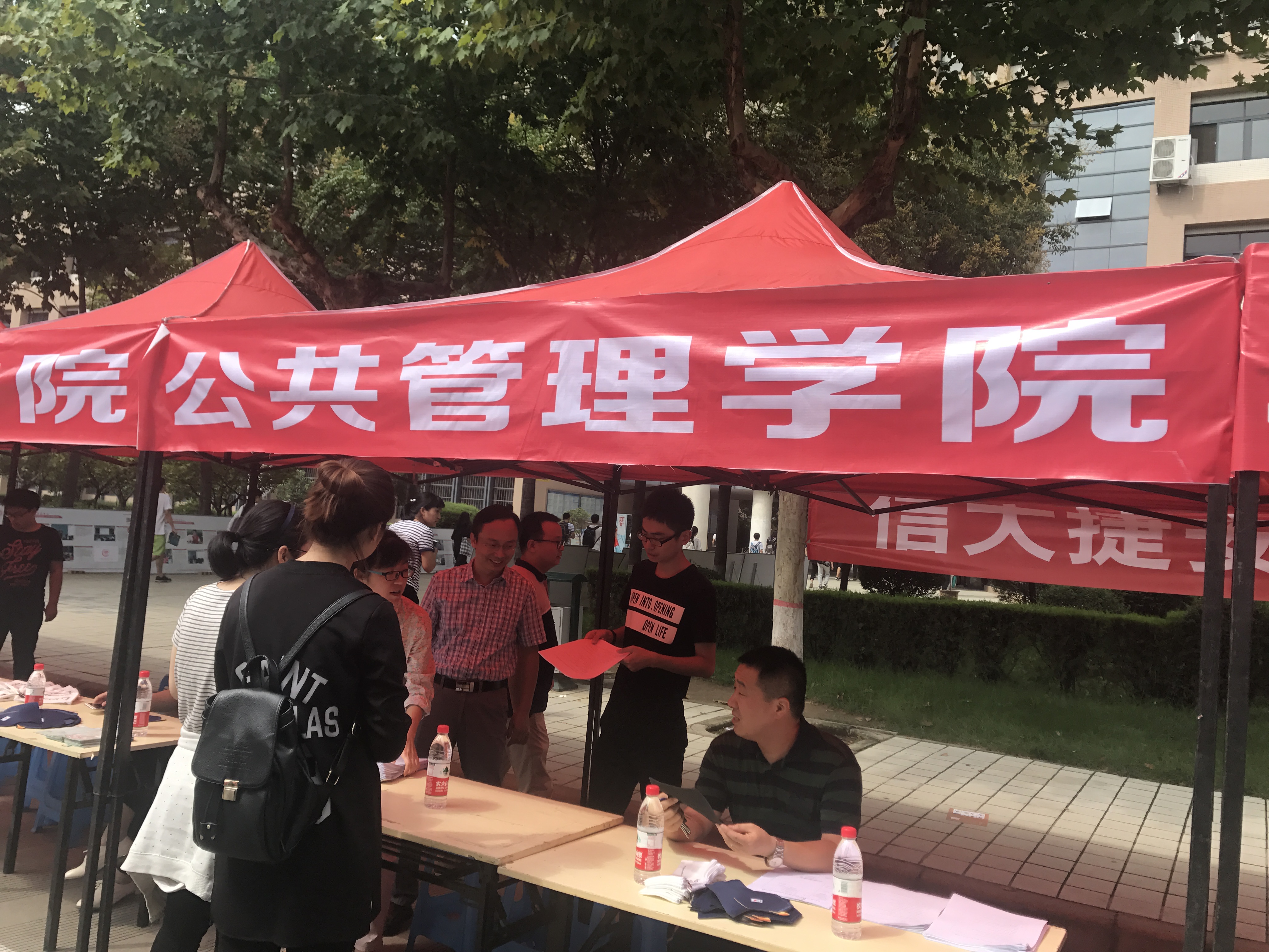 2017年9月18日下午,由研究生院和我院共同承办的西北大学公共管理学院2018年研究生招生宣传日活动在西北大学长安校区1号楼前举行。我院科研副院长雷晓康教授,院长助理翟绍果副教授作为教师代表参加了本次活动,校领导也极为重视此次活动,王正斌副校长,李邦邦书记到场巡视。此次活动中,雷晓康老师和翟绍果老师热情地为前来咨询的学生进行答疑,同时赠送招生简章、参考书目以及近三年学院各专业招生简况和历年真题等资料,并根据我院2018年的招生情况对其专业选择和复习提出了中肯的建议,咨询现场氛围热烈。