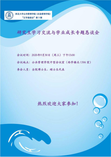 为进一步促进同研究生关于学业、成长方面的交流,及时了解研究生普遍存在的困惑与难处,以便能为研究生的成长提供更具针对性的帮助与支持,9月30日下午14:00,公共管理学院正学恳谈会第3期在西北大学长安校区西学楼13层公共管理学院中型会议室举行,会议围绕“研究生学习交流与学业成长”专题进行交流。公共管理学院科研副院长翟绍果、党委副书记韩杰、研究生教学科研秘书邢莉老师以及部分博士、硕士生代表共计16人次参加了此次恳谈会。
