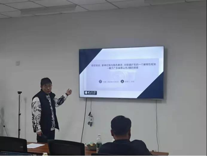 2021级公共管理学博士许珂汇报的题目是《职权统合、新单位制与角色悬浮:对于街镇扩权的一个解释性框架——基于广东省J镇的实践》,基于类型学划分将街镇扩权分为主动、被动,隐性与显性,梳理了目前学界对于这四种分权的研究,尤其阐述了街镇隐性扩权的逻辑。然后对于职权统合、新单位制、角色悬浮、剩余事务四个解释性概念分别阐述,并介绍了本文研究框架和思路。