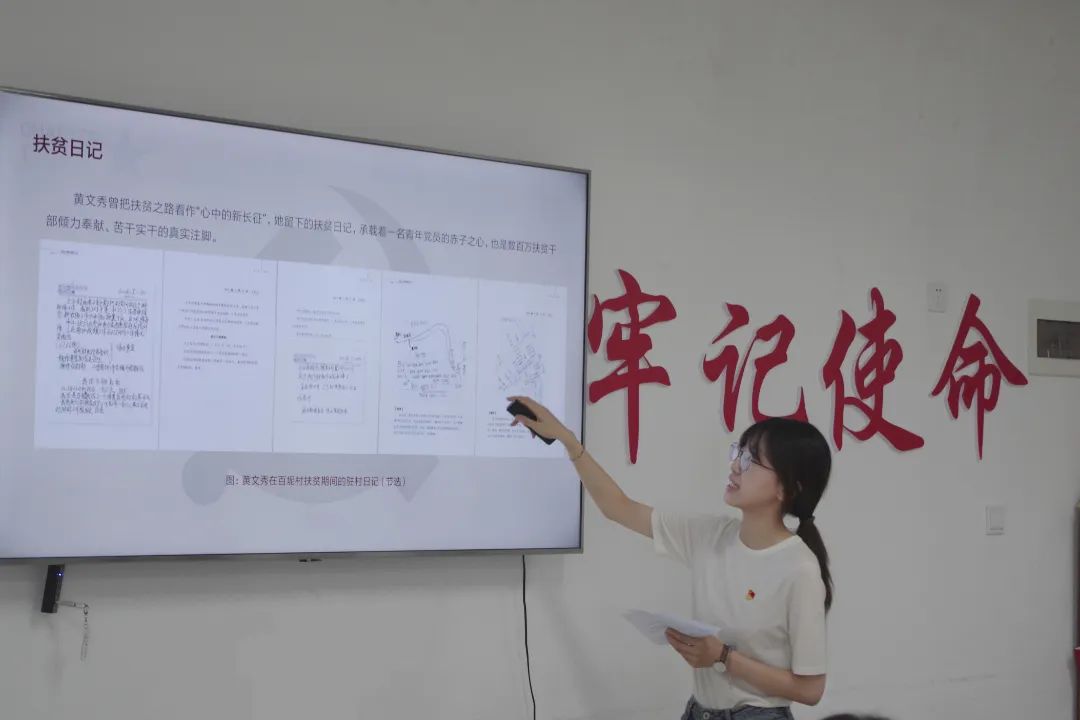 青年委员马莹同志讲述了时代楷模黄文秀同志作为第一书记的光荣事迹。以黄文秀扶贫日记中的片段为切入点,讲述“一代人有一代人的长征”、“一代人有一代人的担当”、“只有扎根泥土,才能懂得人民”几个部分的内容,提出公共管理专业的学生需要具有公共管理的学科视野,具备充分的社会责任感,对于国家、社会及所处时代形成更多思考,将自己的生命与中国最为真实的基层社会发生碰撞、融合,将论文写在祖国大地上。最后马莹同志倡议广大党员同志以黄文秀同志为榜样,不忘初心、牢记使命、勇于担当,甘于奉献,在新时代的长征路上做出更大的贡献。
