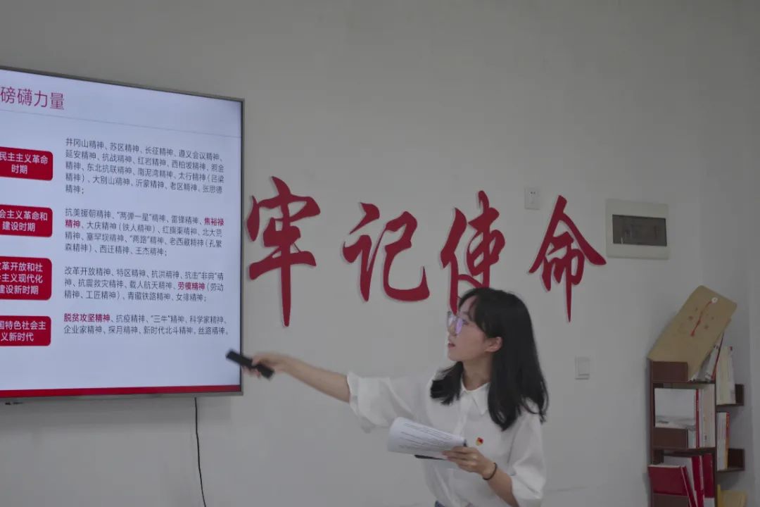 支部书记席祎瀛同志首先回顾了习近平总书记在庆祝中国共产党成立100周年大会上概括提出的伟大建党精神,以中国共产党人的精神谱系为“思维导图”阐释伟大建党精神作为“精神之源”的内涵与实质。同时,她详细介绍从精神谱系中梳理出的6组高频关键词与伟大建党精神内核的统一性,阐释伟大建党精神作为贯穿中国共产党人精神谱系的一条红线,是党的各种精神的高度概括和凝练。