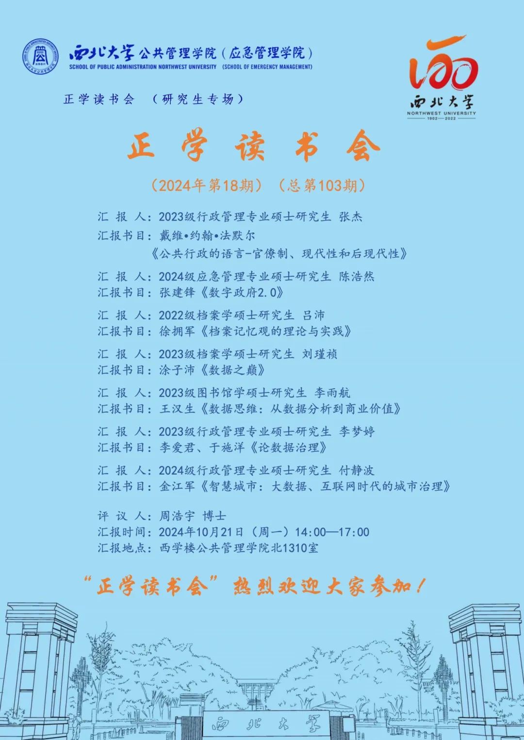 2024年10月21日,我院在西学楼北1310举办了2024年第18期正学读书会。西北大学公共管理学院2023级行政管理专业硕士研究生张杰、2024级应急管理专业硕士研究生陈浩然、2022级档案学硕士研究生吕沛、2023级档案学硕士研究生刘瑾祯、2023级图书馆学硕士研究生李雨航、2023级行政管理专业硕士研究生李梦婷、2024级行政管理专业硕士研究生付静波分别作为主讲人进行读书汇报,公共管理学院2023级博士研究生周浩宇担任评议人,部分研究生旁听了此次报告会。