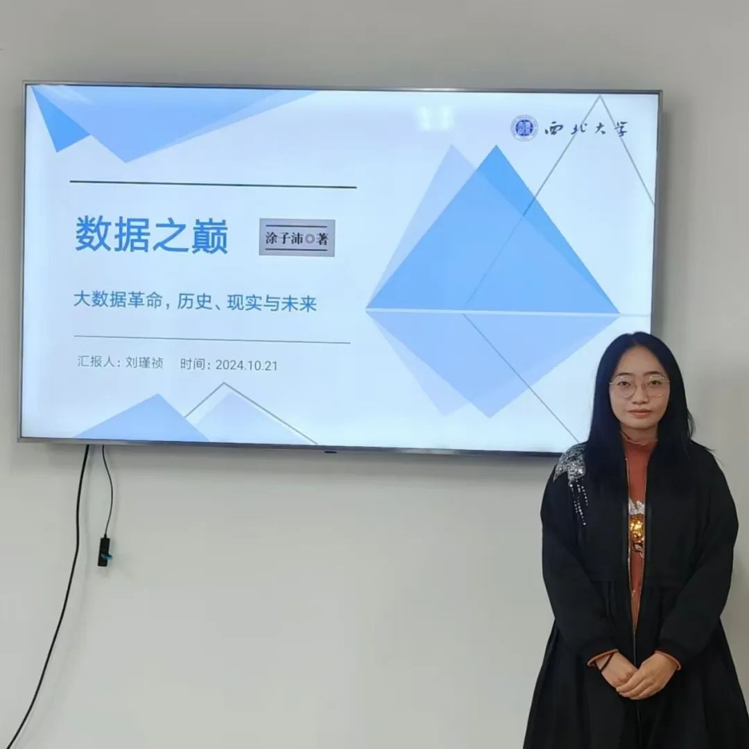 2023级档案学硕士研究生刘瑾祯分享的书籍是涂子沛的《数据之巅》,她主要从作者简介、主要内容、个人感悟三方面进行阐述。刘瑾祯同学通过列举书中丰富的历史案例,如美国建国初期的人口普查、南北战争期间的数据辩论、镀金时代的数据驱动创新等,生动地展示出数据在推动社会进步和国家治理中的重要作用。这些案例让同学们对数据有了更深入的理解,更进一步认识到数据文化的价值和意义。在分享的过程中,刘瑾祯同学不仅向在座的同学们传达了书中的内容,同时也结合自身经历提出思考。最后,她表述了自己对这本书的感悟与理解:数据已成为当今社会的一种重要资源,它不仅让我们对数据有了更深入的认识和理解,也让我们看到了数据在未来的巨大潜力和价值。因此,我们应该更加重视数据文化的建设,培养数据意识和数据素养,让数据成为推动社会进步和创新的重要力量。