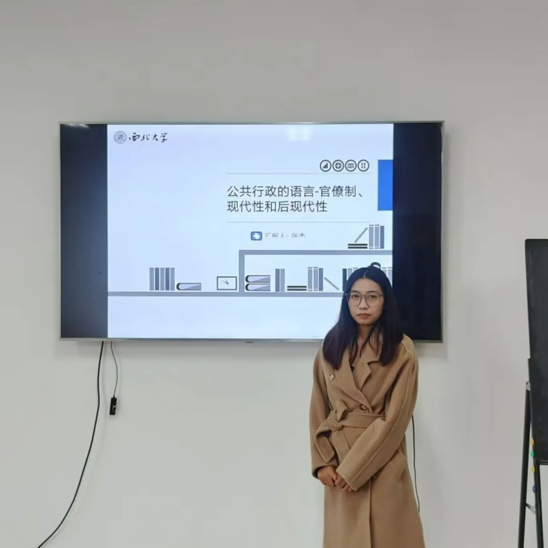 2023级行政管理专业硕士研究生张杰分享的书籍是戴维·约翰·法默尔的《公共行政的语言-官僚制、现代性和后现代性》,她从作者简介、写作背景与理论发展、现代公共行政理论范式的解构、后现代公共行政的建构以及个人思考五个部分展开。首先,她简要介绍了作者法默尔,强调了作者对后现代公共行政理论的贡献,以及现代公共行政的发展脉络与特点、后现代公共行政的兴起与特点,指出了本书的写作背景。接着,她主要从现代公共行政理论范式的解构和后现代公共行政的建构对这本书展开阐释,对于解构方面,她重点介绍此书关于解构的五个方面:特殊主义、科学主义、技术主义、企业思维和解释学,并指出了这五方面所导致的矛盾。同时,她也解释了书中作者对后现代公共行政理论从想象、解构、非地域化、他在性建构的四个内容的含义。最后,在个人思考部分,她结合本专业研究视角,认为可以学习借鉴西方公共行政学的研究方法、研究标准与研究态度,提出了应从中国的国情出发,批判性地吸纳后现代性的合理性思想来重塑现代性。
