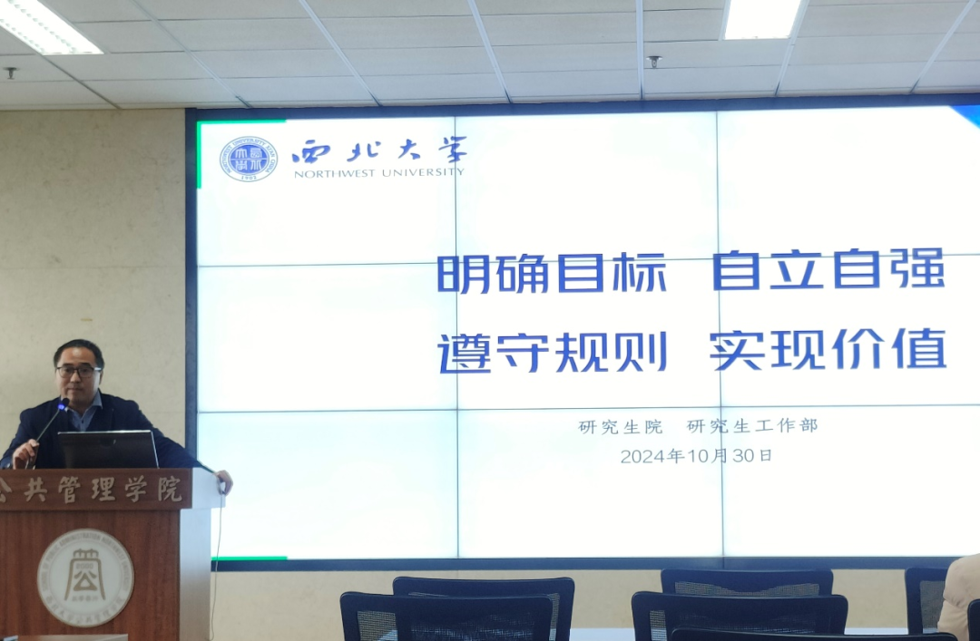 会上,校研究生院副院长冯建涛老师以《明确目标、自立自强、遵守规则、实现价值》为题,从研究生在读期间遇到的问题切入,结合我院学生学习情况,解读研究生教育方面的学校文件,对《西北大学研究生管理规定》《西北大学研究生学籍管理规定》及相关办法的具体内容进行说明,从硕博学制、学习年限,研究生单独毕业、结业条件方面着重提醒。此外,冯老师强调端正学术态度,坚持原创性思考,严禁学术不端行为。