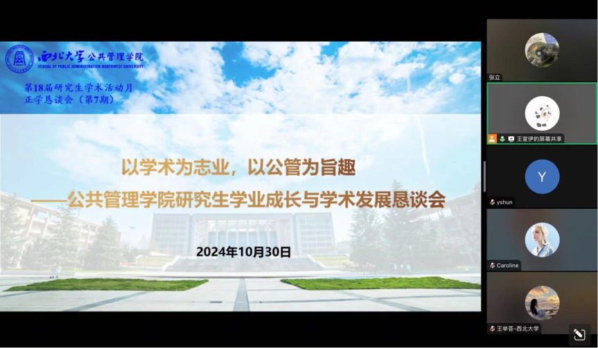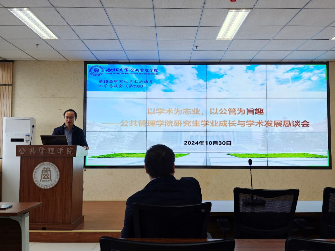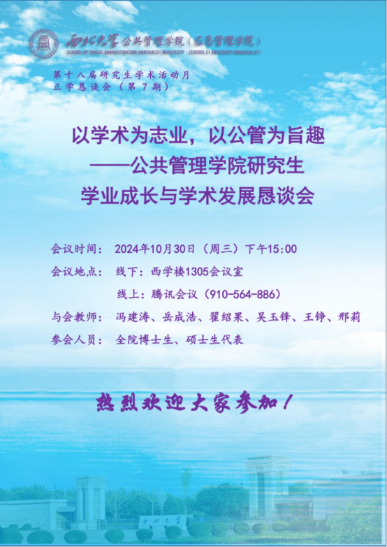 为进一步提升我院研究生管理效率与教学质量,多方面了解、回应研究生诉求,加强学校、学院同学生间的交流互信,建立思想、意见、问题沟通渠道。2024年10月30日,公共管理学院在西学楼1305会议室召开主题为“以学术为志业,以公管为旨趣”的正学恳谈会(研究生专场),本次会议采用“线上+线下”方式同步进行。校研究生院副院长冯建涛、我院科研副院长翟绍果、外事副院长岳成浩、社会保障学系主任吴玉锋、公共信息资源管理系主任王铮、研究生秘书邢莉以及全院硕博研究生代表参与本次会议,会议由翟绍果教授主持。
