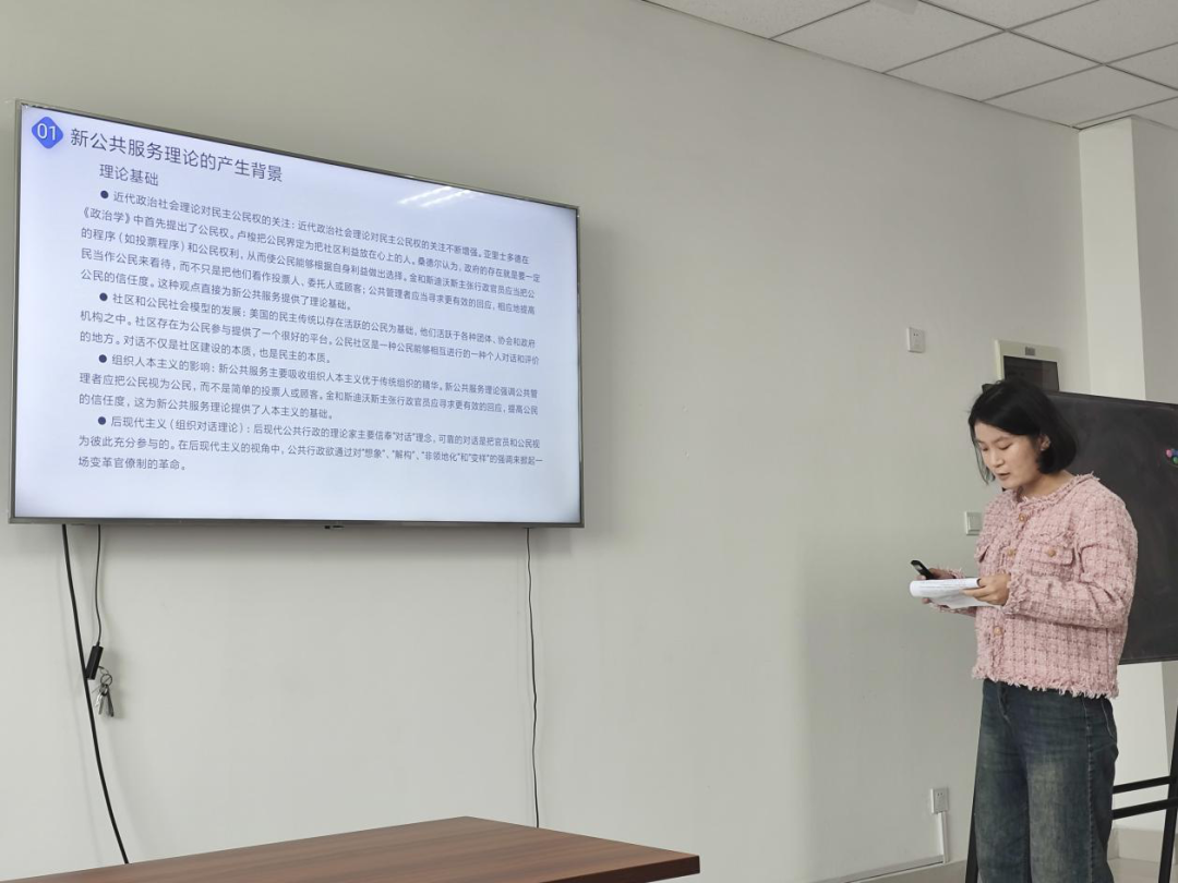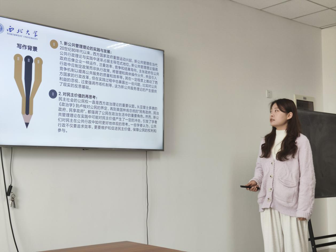 2024级行政管理专业硕士研究生 吕艳虹分享的书籍是珍妮特V·登哈特的《新公共服务:服务,而不是掌舵》,她从作者简介、观点论述、简要述评、建设服务型政府四个方面展开分享。首先她对作者做了一个简要的介绍,该书主要讲述了首先,介绍公共行政与新公共管理的区别与联系,新公共服务的来源;其次,介绍新公共服务理论的核心观点和实际应用;最后,结合案例展望新公共服务的未来。之后,分析了这本书的时代背景、理论基础以及作者个人因素分析了本书产生的背景,对比了传统公共行政、新公共管理与新公共服务的概念,从而提出了新公共服务理论的基本内涵。接着她做出了对本书的简要述评,分析了新公共服务理论的意义与局限性。最后,她表述自己对建设服务型政府的理解,着重强调要构建中国特色的服务型政府。