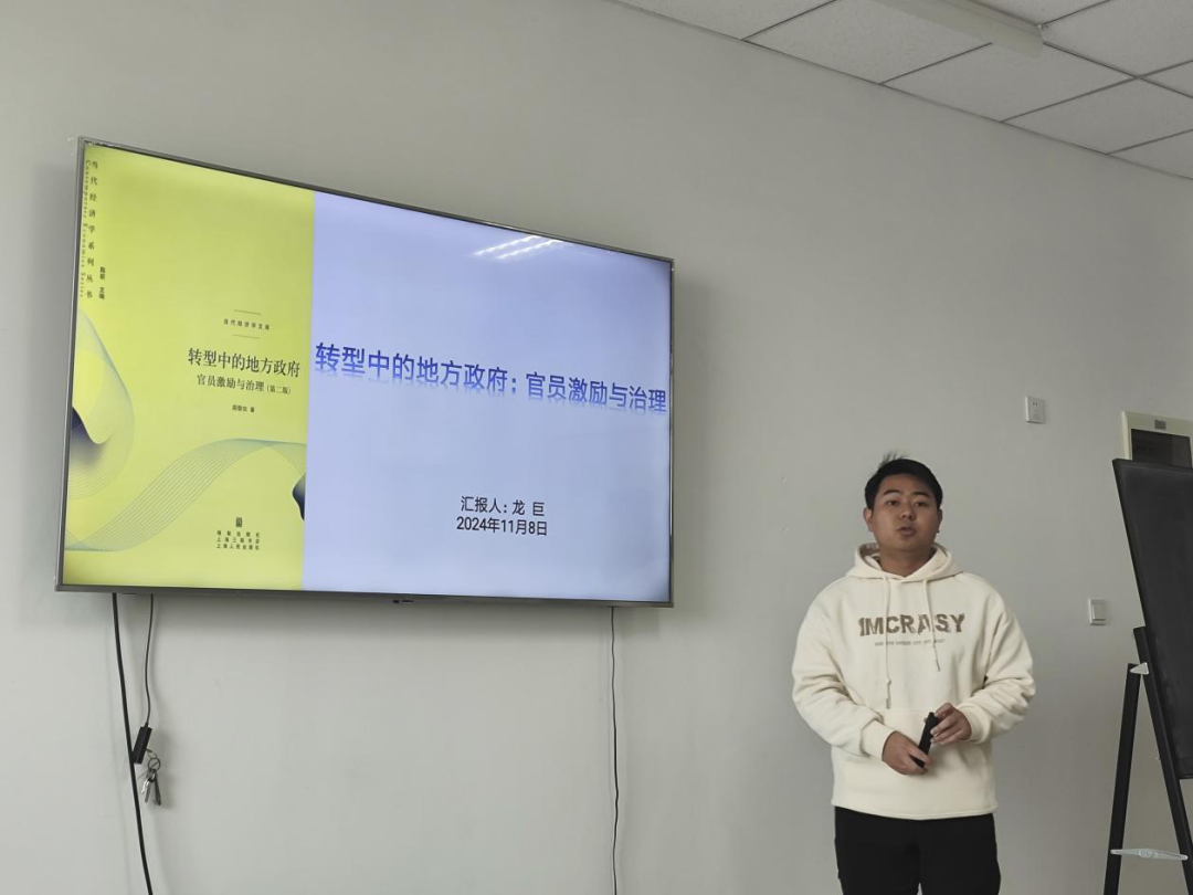 2023级行政管理专业硕士研究生龙巨分享的书籍是周黎安的《转型中的地方政府:官员激励与治理》一书,他主要介绍了本书的背景、围绕着行政发包制、转型中的地方分权以及转型中的财政分权。首先他分析了地方政府与中国经济增长之谜,提出“经济的增长是靠什么引起的?物质增长?人力资本增长?技术进步?经济增长的结果?源泉?”的问题,强调制度安排以及制度所提供的强大激励是决定因素。然后提出本书贡献之处在于:在过去很多时候看问题仅仅只是看到政府就够了,不会考虑政府官员或者是说在政府工作的人员,进一步发现政府的人可以得到更有意义的结论。随后他分析了行政发包制的定义、历史原型、新中国成立以来的演变、行政发包程度和范围的决定因素。