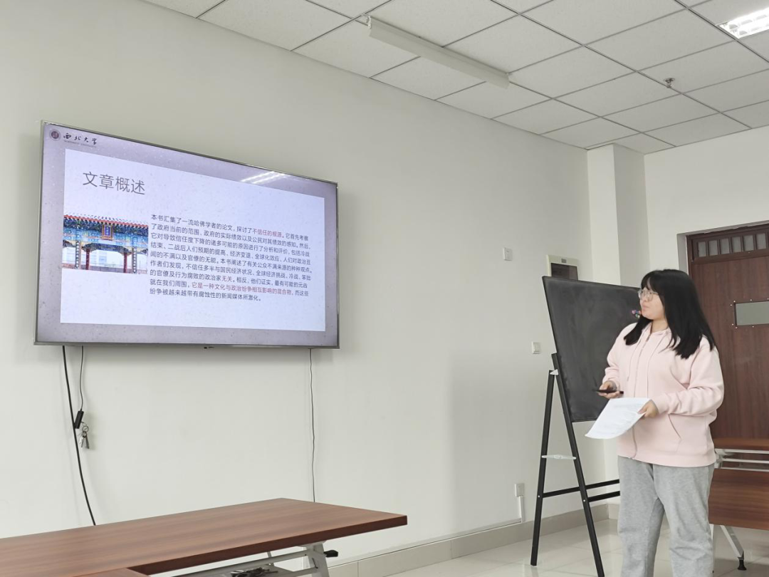 2024级行政管理专业硕士研究生郭熠分享的书籍为小约瑟夫·S.奈的《人们为什么不信任政府》,她分别从文章概述、核心内容、总结和启示这四方面进行了分享。首先对作者以及写作背景进行了简单介绍。其次,在梳理了全书章节和内容后,她从三部分进行介绍,该书第一部分“政府的范围和绩效”分三章,遵循的叙事逻辑是,政府的范围—政府的绩效—公众(对绩效的)感知。书中第二部分“解释的菜单”分章探讨了经济、社会文化、政党政治与政府信任度下降之间的可能关联。第三部分讲有关公众对美国、欧洲及日本治理态度的资料的一些更深层次探讨。接着她对本书内容做了一个总结:本书中的各章表明,对美国政府信任度的下降是一种涉及经济、社会、政治行为的复杂现象。最后分享了自身的阅读启示,再次强调了政府公信力的重要性以及探讨如何认识新媒体特质以及对地方政府公信力里的影响。