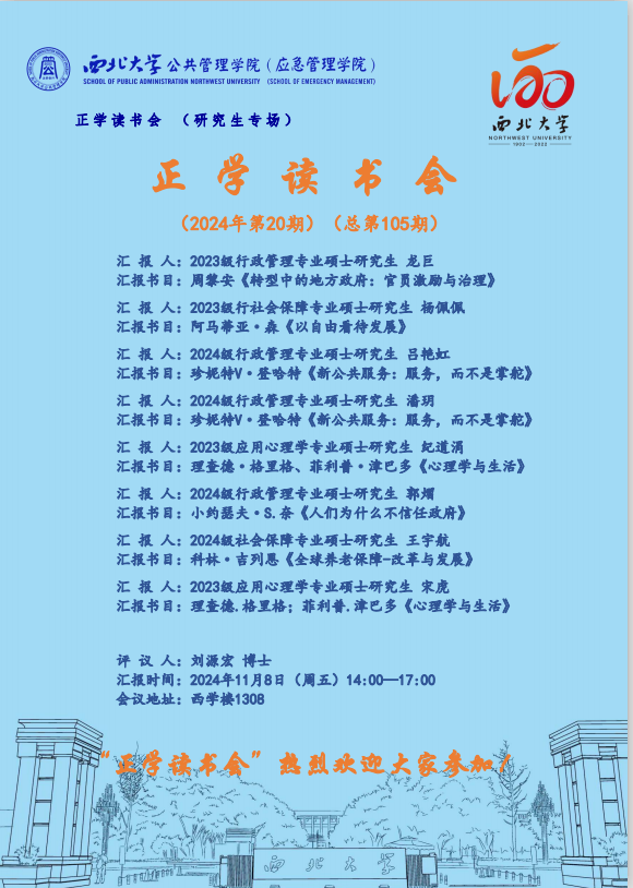 2024年11月8日,我院在西学楼1308举办了2024年第20期正学读书会(总第105期)。西北大学公共管理学院2023级行政管理专业硕士研究生龙巨、2023级社会保障专业硕士研究生杨佩佩、2024级行政管理专业硕士研究生吕艳虹、2024级行政管理专业硕士研究生潘玥、2023级应用心理学专业硕士研究生纪道涓、2024级行政管理专业硕士研究生郭熠、2024级社会保障专业硕士研究生王宇航、2023级应用心理学专业硕士研究生宋虎分别作为主讲人进行读书汇报,公共管理学院2024级博士研究生刘源宏担任评议人,部分研究生旁听了此次报告会。
