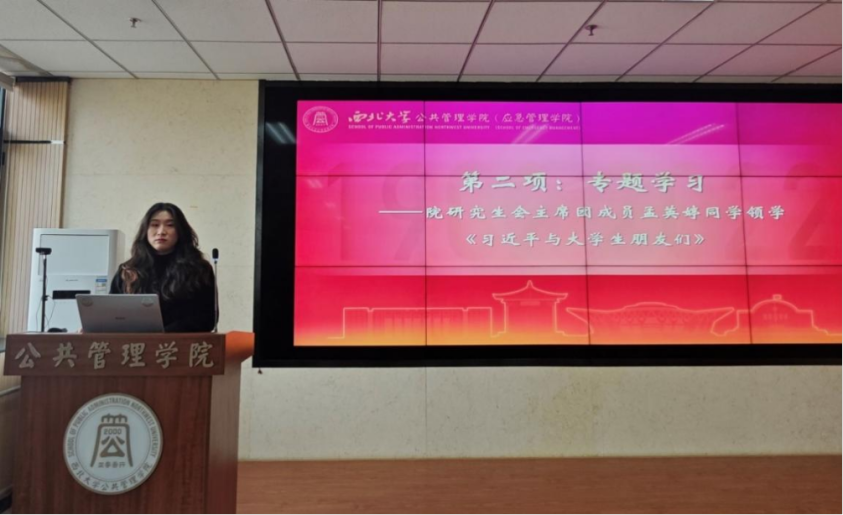 第二项,院研会主席团成员孟英婷同学带领各同学深入学习《习近平与大学生朋友们》一书。通过阅读习近平总书记与各年龄段大学生的交往实录,同学们感受到习近平总书记对青年一代的殷切期望,深感肩负的时代责任。