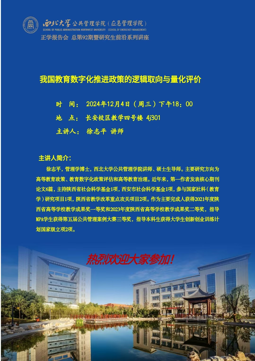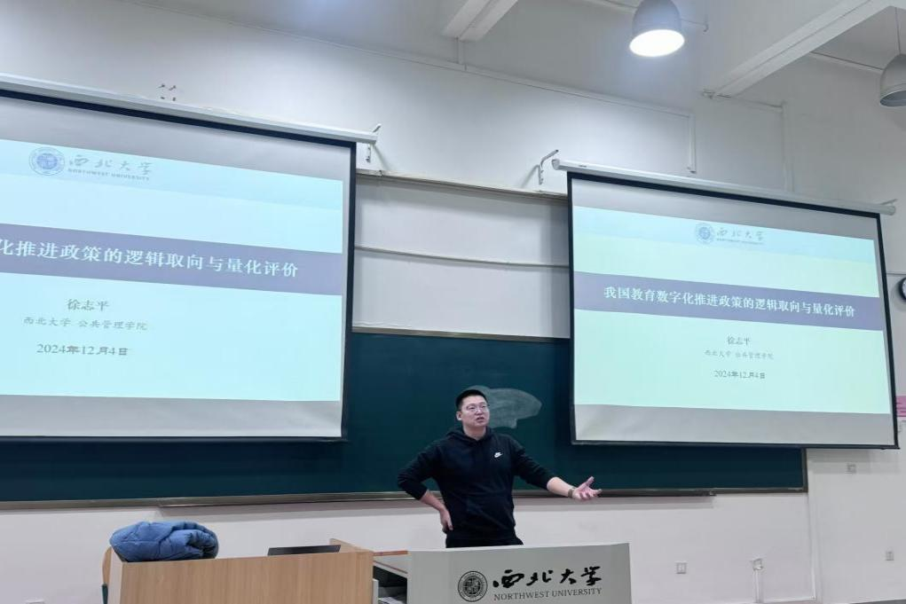 2024年12月4日晚18:00,西北大学公共管理学院徐志平讲师在4J301教室为我院2024级全体硕士研究生作了题为“我国教育数字化推进政策的逻辑取向与量化评价”的专题讲座。