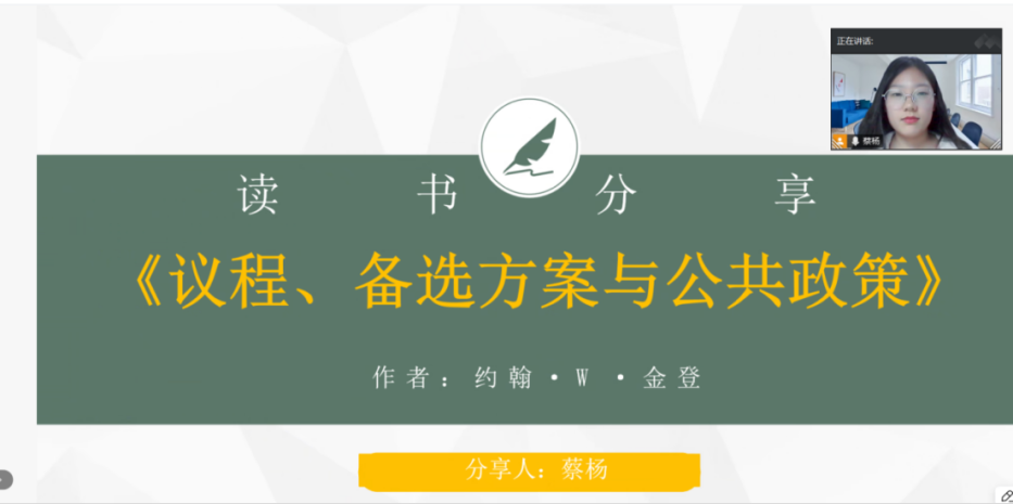2023级行政管理专业硕士研究生蔡杨分享了约翰·金登的《议程、备选方案与公共政策》一书。首先,她指出多源流理论的核心在于问题源流、政策源流、政治源流三者的交织以及政策之窗开启和政策企业家的角色。其次,她详细介绍了多源流理论的重要内容,认为问题流和政治流为议程的设立提供了基础,而政策源流则负责产生备选方案。在这一过程中,不同参与者的思想相互碰撞、融合,政策企业家则对这些思想进行筛选、重组和创新。经过时间的沉淀和筛选,那些符合共同体成员价值观的思想最终会脱颖而出,形成备选方案。当问题流、政策流、政治流这三股力量汇聚一堂时,政策之窗便会开启。此时,政策企业家们会抓住机遇,将问题、政治力量与他们的政策建议相结合,努力推动问题的解决。最后,她对这本书的内容进行总结与反思,认为这本书还存在普适和适用性受限、简化政策议程复杂性的问题。