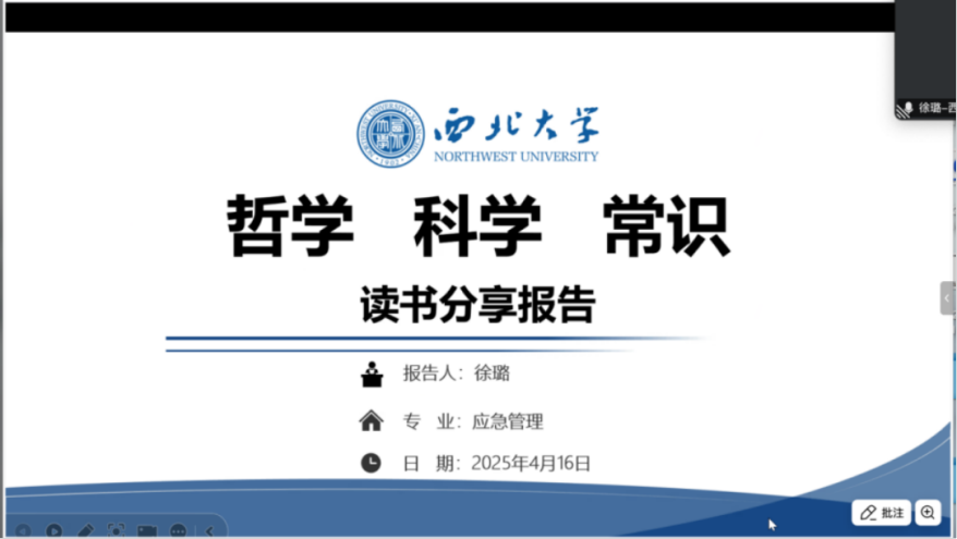 2023级应急管理专业硕士生徐璐分享了陈嘉映的《哲学 科学 常识》一书。她介绍到本书作者从哲学的由来、近代科学的诞生以及哲学与科学的未来三个方面出发,通过多方面的讨论理清了哲学、科学与常识之间的关系,哲学依据常识通过推理而得出结论,哲学意义上的结论不会离常识太远,即使与常识相悖,基于常识经过几步推理就可以理解;科学依据数学和实验得出结论;数学是一门很精确的语言,适合于长程推理,实验是在理论指导下设计出来的,与现实困难存在很大差别,因此,很多科学结论是无法依靠常识来理解,甚至与常识完全相悖。徐璐同学提到感应思维虽与现代科学有别,但其创造的认知原型仍有影响,不可谓过时;哲学早于科学,为科学提供养分,助力提出突破性假设。社会科学研究结论可与常识相悖但不宜太远,与哲学有相似性,且其认可与否非判断标准,与自然科学一样都是探索规律、构建理论。科学理论中解释与预测本质相同,判断理论可靠性要看其能否准确预测新现象。