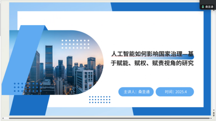2024级行政管理专业硕士研究生桑圣通分享了梅立润所著的《人工智能影响国家治理的复合机制研究》一书。他结合书中核心观点,从技术赋能、技术赋权、技术赋责三个维度展开陈述,系统探讨了人工智能如何重塑国家治理的逻辑与形态。首先,桑圣通通过“技术赋能”视角,阐述了人工智能在提升国家治理能力中的关键作用。他指出,AI在信息采集、政策制定和组织协同等方面展现出显著优势,例如通过算法优化实现信息归类与规律挖掘,借助仿真模拟提前识别政策执行障碍,并利用智能化痕迹管理打破部门间的信息壁垒。其次,在“技术赋权”部分,他分析了人工智能如何改变权力结构,强调技术企业因掌握数据与算法资源而崛起为治理新主体,同时跨国技术依赖可能引发“超级国家”现象,进一步影响国家主权的独立性。最后,他结合“技术赋责”视角,探讨了AI带来的新型治理责任,包括算法偏见的监管、失业与隐私危机的社会安抚等,并提出以人为本的治理原则以规避技术滥用风险。