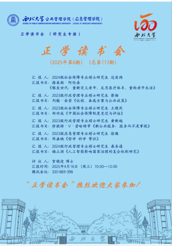 2025年4月16日,我院在线上举办了2025年第6期正学读书会(总第117期)。西北大学公共管理学院2024级社会保障专业硕士研究生边奕玮、2023级行政管理专业硕士研究生蔡杨、2023级社会保障专业硕士研究生王晓凤、2023级行政管理专业硕士研究生黄新越、2023级应急管理专业硕士研究生徐璐和2024级行政管理专业硕士研究生桑圣通分别作为主讲人进行读书汇报,公共管理学院2023级博士研究生贺晓迎担任评议人,部分研究生旁听了此次报告会。