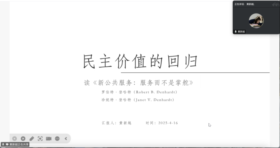 2023级行政管理专业硕士研究生黄新越分享了罗伯特·B·登哈特等所著的《新公共服务:服务而不是掌舵》一书。她主要从作者简介、写作背景、结构安排、内容概述以及不足与现实启示五个方面展开陈述。首先,她通过梳理登哈特夫妇的学术轨迹和新公共行政学派的理论沿革,揭示了该书对传统公共行政范式的批判立场。其次,她对本书的写作结构进行了细分,将新公共服务理论的主要内容划分为公共服务内容、公共服务过程以及公共服务原则三部分。紧接着,她运用比较分析法,将老公共行政的效率导向、新公共管理的市场逻辑与本书倡导的民主治理范式进行历时性对话,介绍了本书的写作思路和论述内容。最后,她结合自身专业对本书进行了评述,指出本书在理论和实践层面可能存在的缺陷,并提出三重本土化启示:政府职能谱系的“划桨—掌舵—服务”动态平衡观、宪政伦理与管理效能的融合治理路径以及政社协同的公共服务供给模式创新。