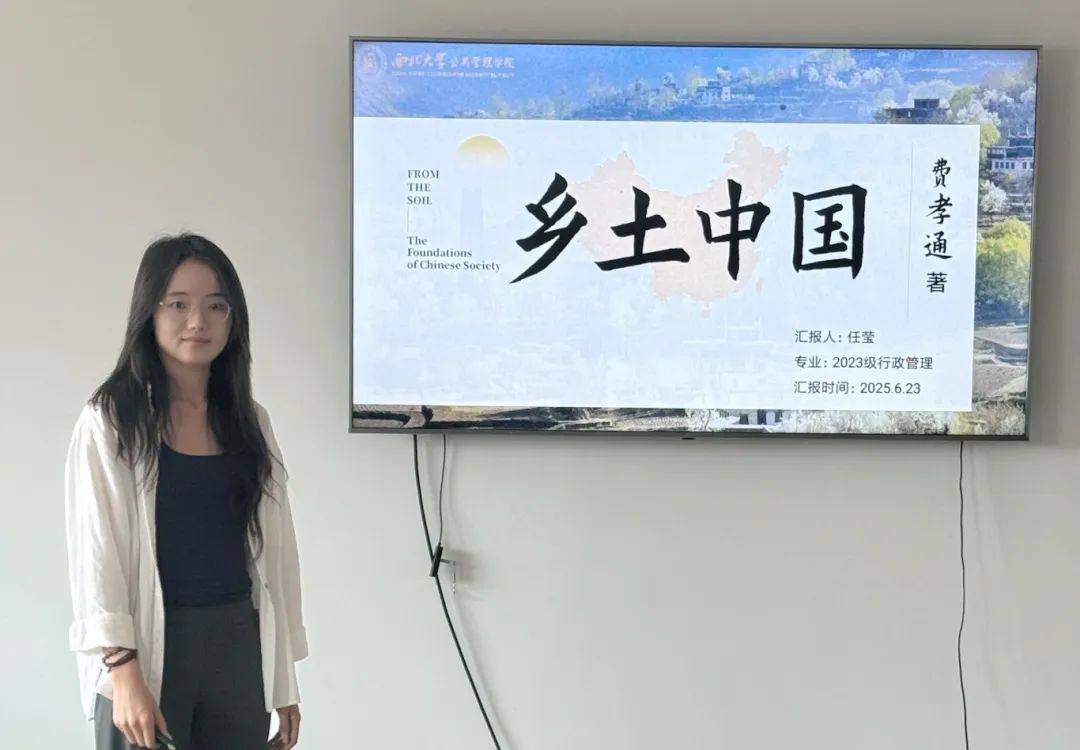 2023级行政管理专业研究生任莹同学从《乡土中国》的核心概念出发,系统梳理了费孝通提出的“差序格局”“礼治秩序”“乡土伦理”等理论,结合中国农村社会实例,分析了传统乡土社会的结构特征与现代转型困境。她特别指出:“费孝通先生笔下的‘乡土’不仅是地理概念,更是一种文化根脉。在城市化进程中,如何平衡传统与现代性,仍是值得思考的命题。”汇报内容条理清晰,展现了扎实的文本分析能力。