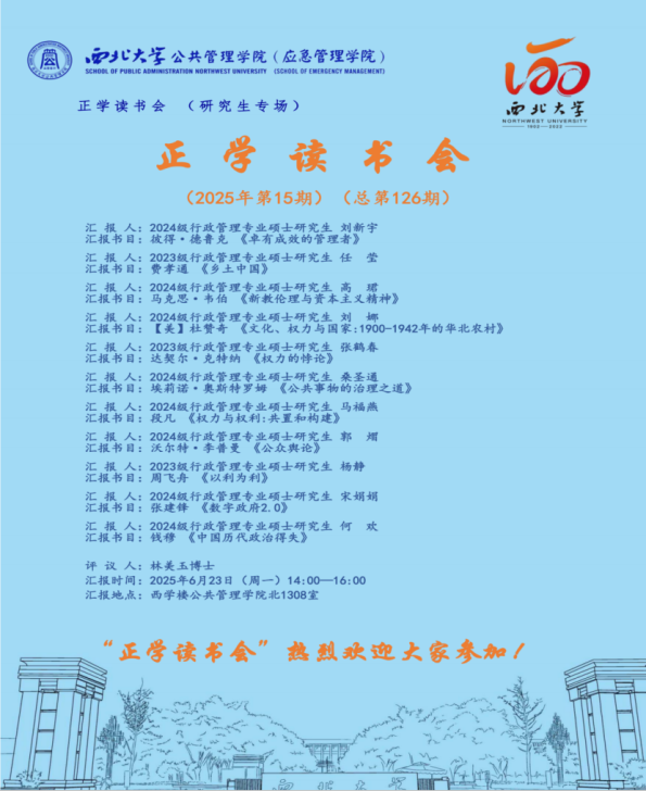 2025年6月23日,我院在西北楼北1308举办了2025年第15期正学读书会。西北大学公共管理学院2024级行政管理专业硕士研究生刘新宇、高珺、刘娜、桑圣通、马福燕、郭熠、宋娟娟、何欢,2023级行政管理专业硕士研究生任莹、张鹤春、杨静分别作为主讲人进行读书汇报,公共管理学院2025级博士研究生林美玉担任评议人,部分研究生旁听了此次报告会。