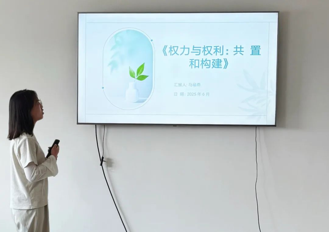 2024级行政管理专业硕士研究生马福燕分享的书籍是段凡的《权力与权力:共置和构建》。她从核心概念解析、发展脉络和现实启示三个方面展开。以公权力与私权利关系以及彼此的强弱变化为切入点,沿着历史的脉络分析了二者之间的关系,梳理出公权力和私权利发展的四个阶段:公权力与私权利的短暂平衡;公权力的畸形崛起与私权利空间的萎缩;私权利的人性成长与公权力的理性退让;公权力和私权利共置空间的生成。最后得出现实启示即在公权力与私权利这个问题上,流变是两者的常态,我们根据当下行动主体多元化的趋势,倾向于认为未来的公权力与私权利改革借助行动主义,将继续从边界模糊走向制度平衡。从“权力制度”转向到“法律制度”,两者将以“制度”的名义来构筑全面深化改革的场域,从而描绘公权力和私权利改革的图景。
