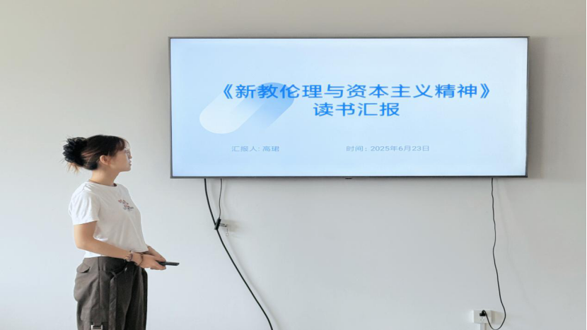 2024级硕士研究生高珺分享的书籍是马克思·韦伯的《新教伦理与资本主义精神》,她从社会学经典视角切入,结合行政管理学科特点进行汇报。首先,她梳理了韦伯的写作背景:19世纪末,欧洲资本主义蓬勃发展,但韦伯敏锐指出,技术进步并非唯一动因。他以中国、印度等文明为例,提出核心问题——为何资本主义精神仅在西方兴起?韦伯认为,新教伦理(尤其是禁欲主义与“天职观”)为资本主义的诞生提供了文化根基。其次,她以“宗教信仰—伦理观—生活行为—资本主义精神”为逻辑主线,解析了韦伯的论证链条。她指出,韦伯认为新教“天职观”将世俗工作神圣化,推动劳动者以敬畏心态投入生产;而“理性禁欲”则要求节俭克制,将财富视为“上帝的信托”,而非个人享乐工具。这种伦理观催生了资本主义精神的核心特征——理性化、效率化与契约精神。最后,韦伯同时预言了资本主义的“铁笼”困境:当禁欲主义消退,工具理性可能压倒价值理性,导致个体被经济系统异化。